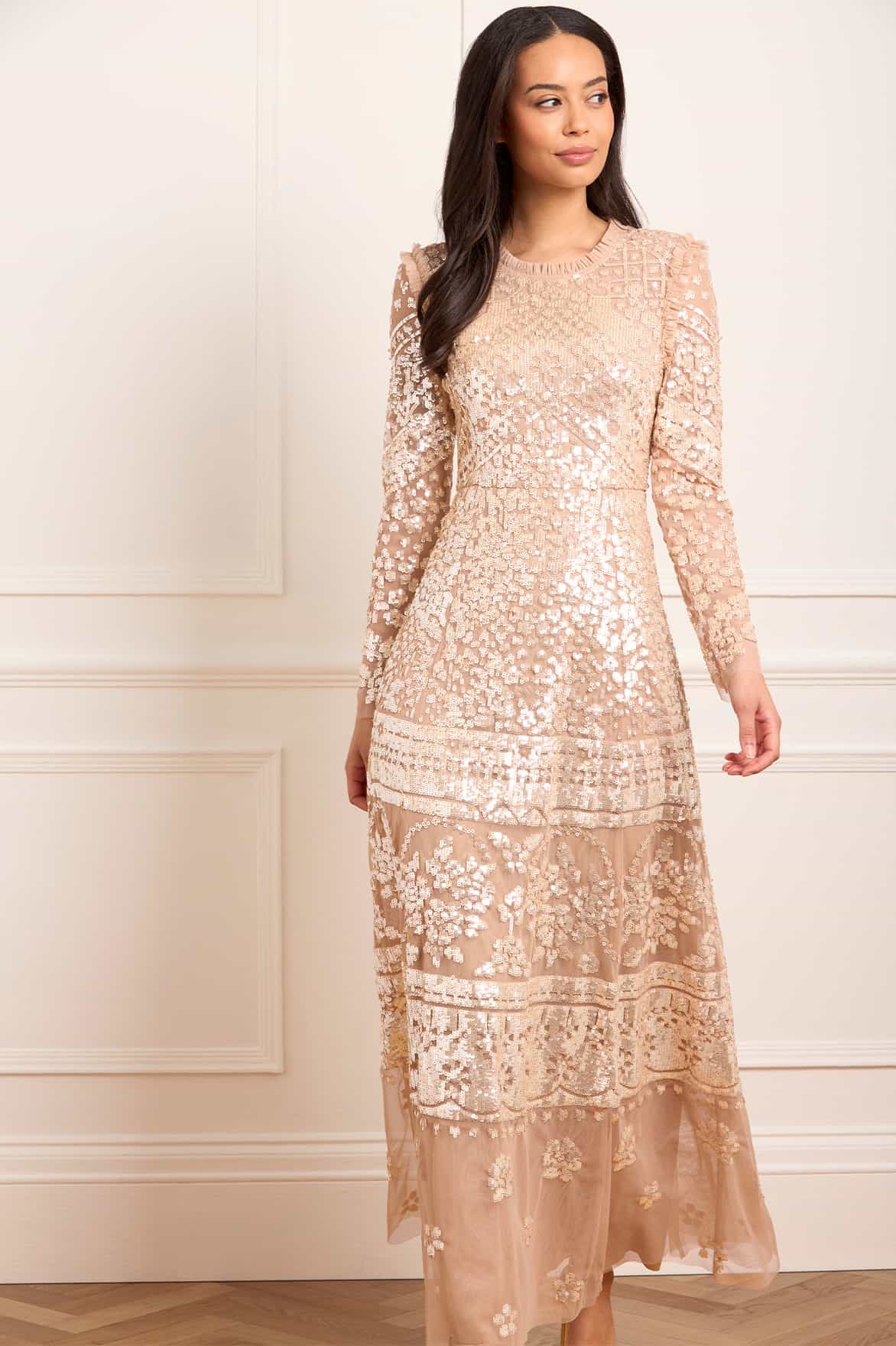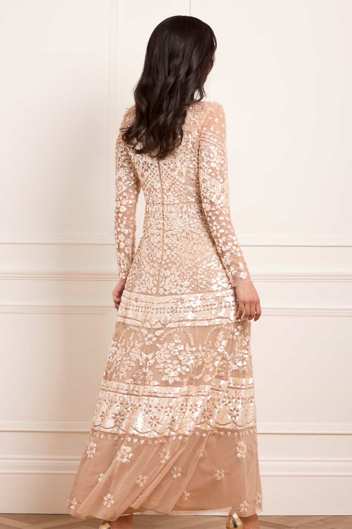 The Aurora Gown in Butterscotch/Gold. A signature Needle & Thread style from the archive, this timeless gown draws inspiration from antique tablecloths of the early 1900s. Intricately crafted with a shimmering placement border of sequins, it celebrates the art of vintage craftsmanship. The elegant silhouette features a round neckline, slim long sleeves, and delicate tulle frills at the neckline and armholes—a hallmark of the brand. Finished with layers of soft, romantic tulle, this heritage piece captures classic beauty with a modern edge.