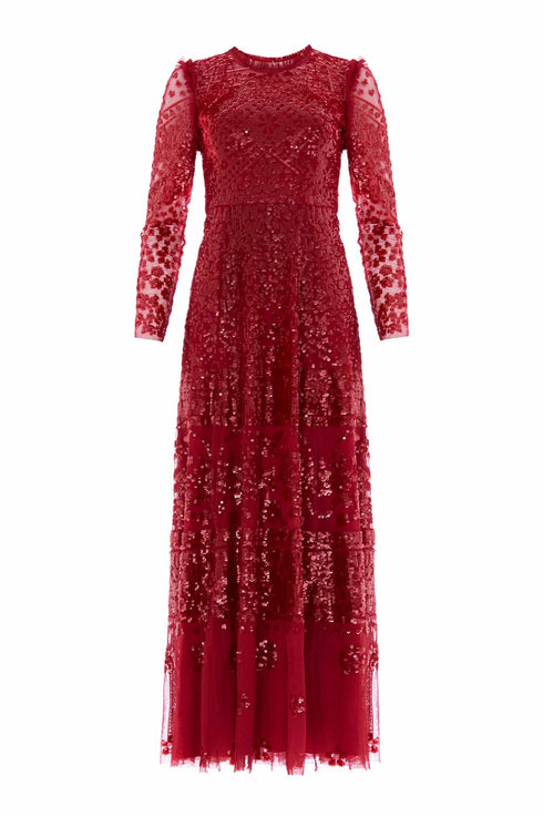 NEW SEASON | NEEDLE & THREAD EXCLUSIVE. The Aurora Gown in Cherry Red. A reissue of one of Needle & Thread’s most loved archival styles. Intricate embroidery and tonal sequins embellish the gown’s tulle base, creating a romantic, heritage-inspired look. In a vibrant, festive hue, this ankle-length silhouette makes an unforgettable impression for the winter season’s most special occasions.