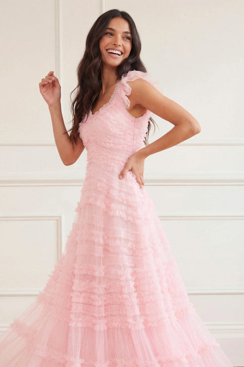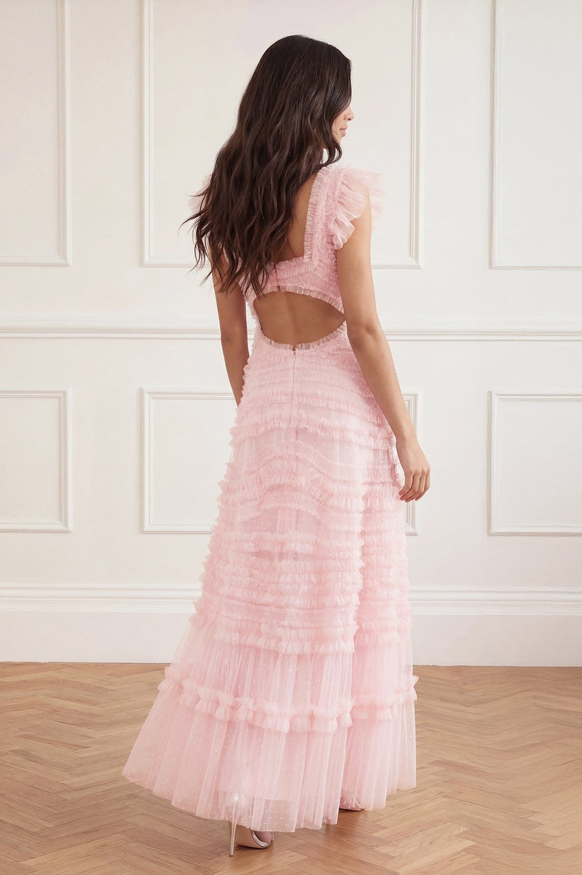 NEW SEASON | NEEDLE & THREAD EXCLUSIVE. The Amara Backless Gown in Peony Pink. Designed with sweeping ruffle detailing inspired by romantic English gardens, creating soft movement through the silhouette. The dramatic open back and flowing skirt offer an elegant, effortless occasionwear style.