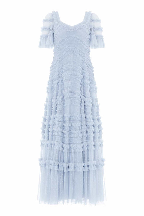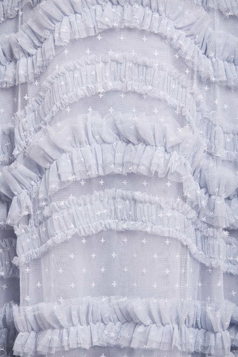 NEW SEASON. The Amara Ruffle Gown in Skylight. A true statement of romantic artistry. Crafted from layers of frothy tulle, the gown features curved bands of ruffles that flow gracefully across the body and cascade into a voluminous skirt, creating dramatic movement and charm.