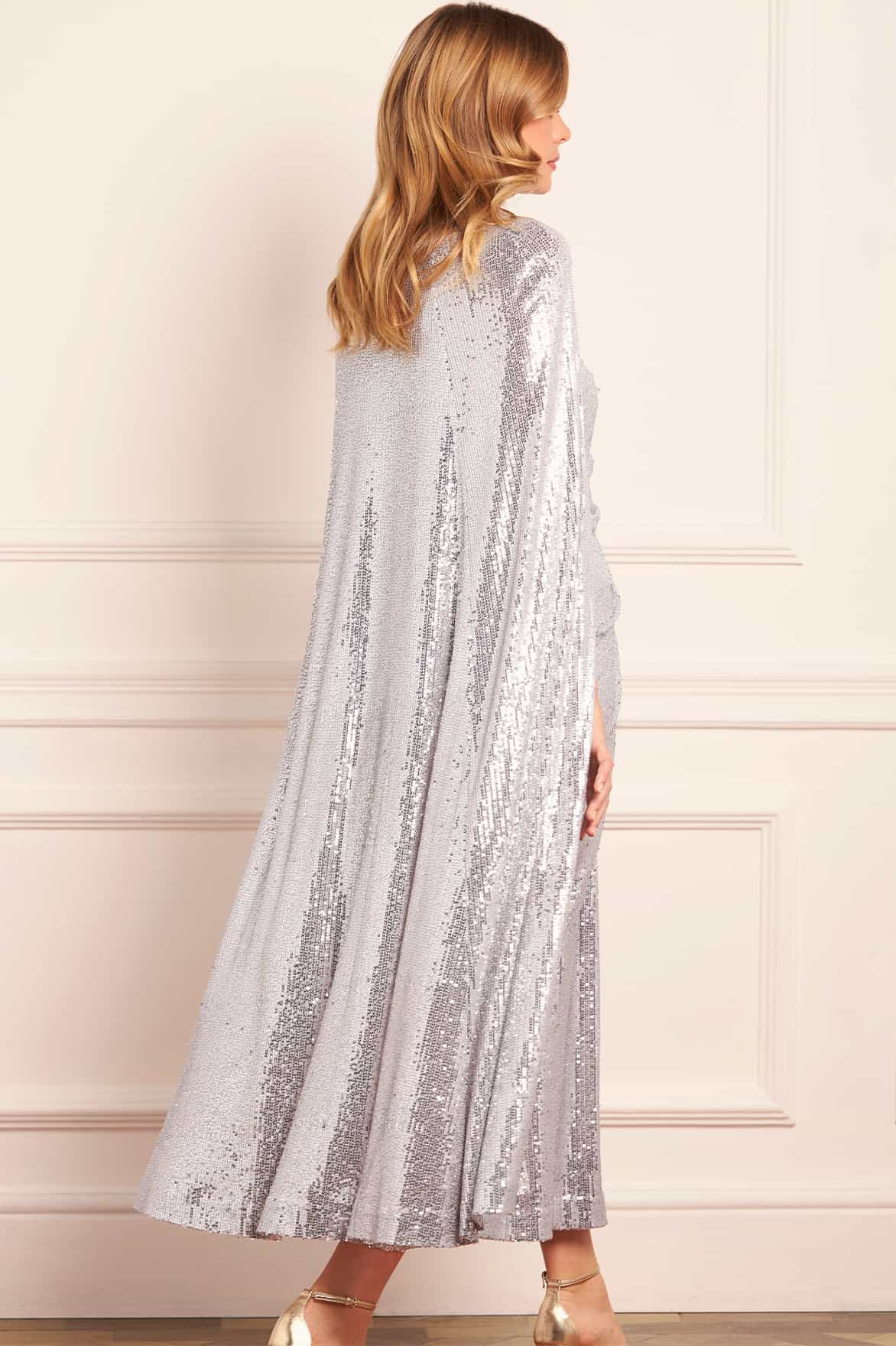 NEW SEASON. Amora Long Cape in Dove/Silver. A celestial-inspired layer designed to elevate evening dressing. Crafted in delicate tulle, the cape is embellished with shimmering sequins in silver tones, creating a starry sky effect that sparkles with movement. The dove-grey base softens the metallic embellishment, adding refinement and romance. A statement piece that transforms any gown, perfect for dramatic entrances and ethereal styling.