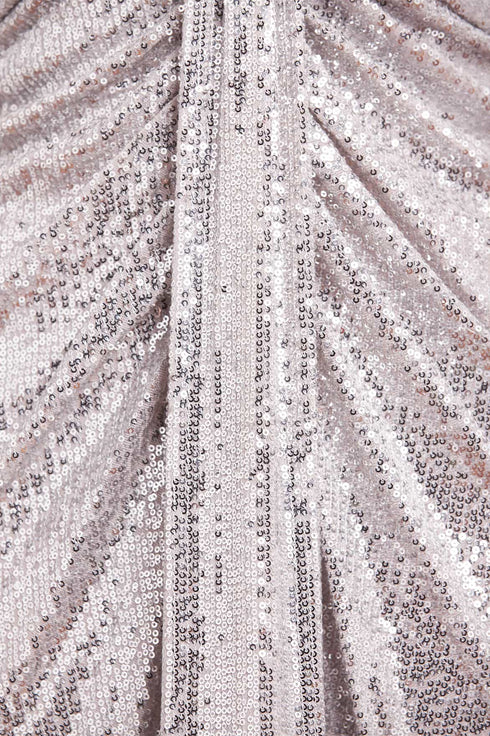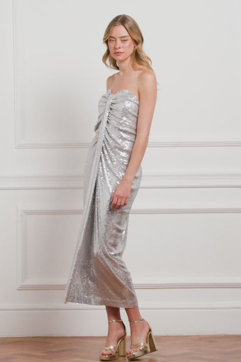NEW SEASON. Amora Strapless Ankle Gown in Dove/Silver. A radiant design infused with celestial romance. Cut in a strapless silhouette, the gown is embroidered with glistening silver sequins across layers of soft dove-grey tulle, evoking starlight on a moonlit sky. The fitted bodice flows into a gently flared skirt, balancing structure and lightness. A gown designed for memorable celebrations.