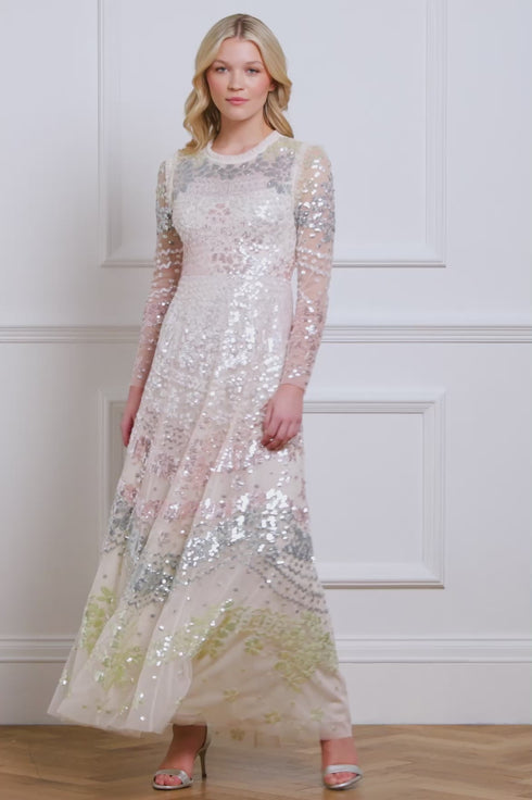 The Angeline Sequin Gown in Cream is inspired by antique lace tablecloths from the 1900s, featuring intricate sequin embellishments in a delicate ombré effect. Beautifully decorated with pastel sequins to create a soft gradient towards the hem, with a high-shine finish for added lustre. Crafted in soft tulle with signature frills, the gown includes slim sleeves and soft tulle ruffles at the shoulder and neckline. The layered tulle and net skirt adds to its ethereal, romantic charm, making it a perfect blend of classic and contemporary style.