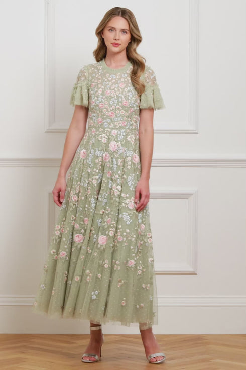 The Antoinettes Floral Round Neck Ankle Gown in Meadow. A nod to the lavish beauty of Versailles, the Antoinette Gown showcases exquisite multicoloured floral embroidery, cascading in delicate clusters toward the hem. The round neckline is framed by signature Needle & Thread tulle ruffles, while short sleeves are finished with softly gathered tulle frills for a whimsical touch. Crafted with generous layers of net and tulle, the ankle-length skirt flows into a graceful, sweeping hemline—bringing timeless romance to any occasion.