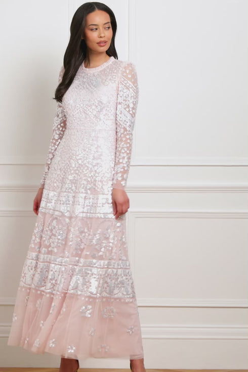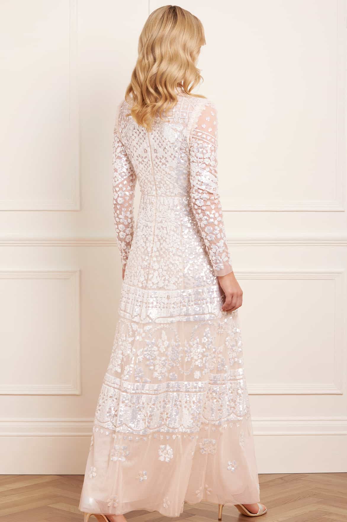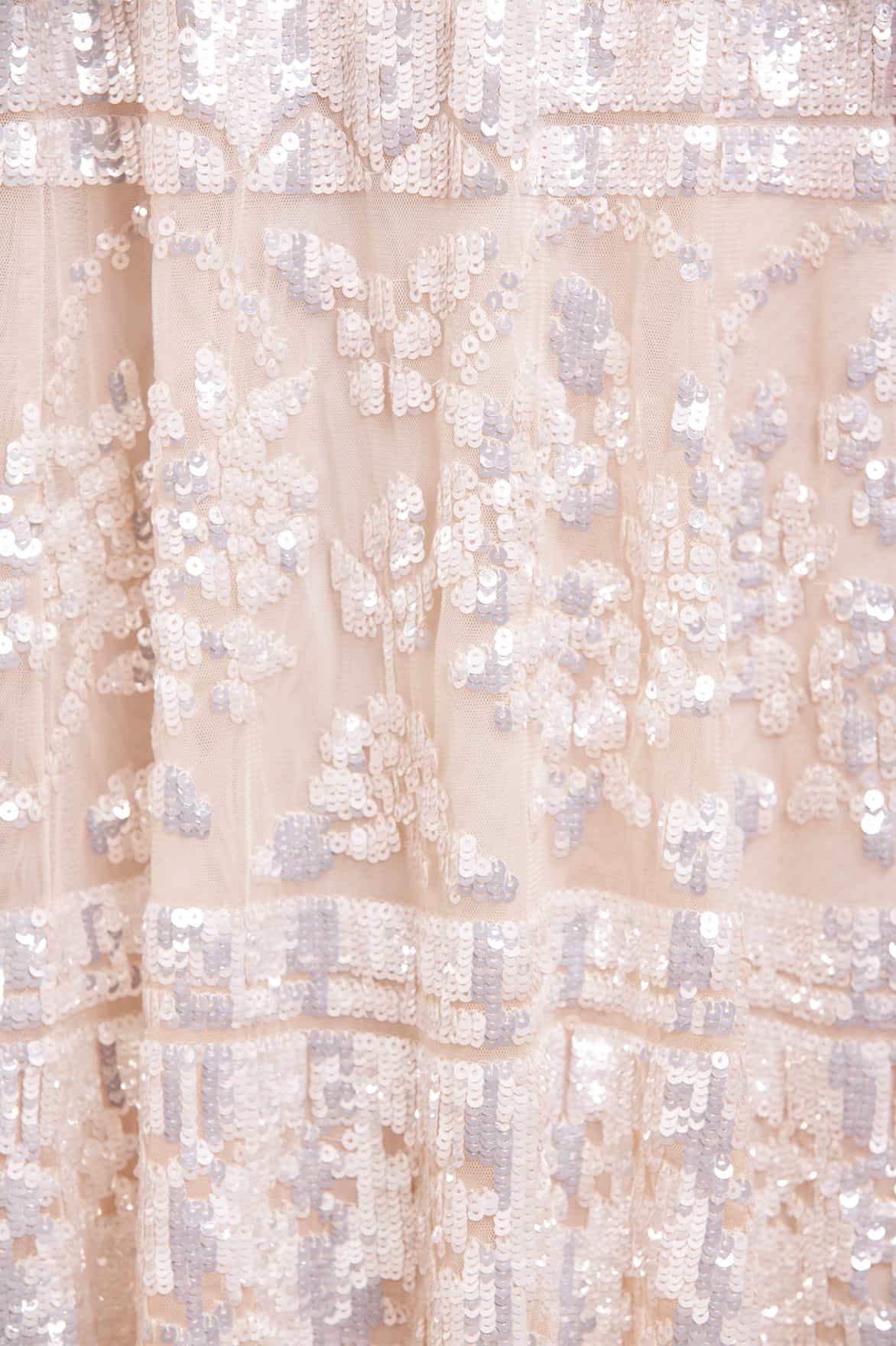 The Aurora Gown in Cream. A signature Needle & Thread style from the archive, this timeless gown draws inspiration from antique tablecloths of the early 1900s. Intricately crafted with a shimmering placement border of sequins, it celebrates the art of vintage craftsmanship. The elegant silhouette features a round neckline, slim long sleeves, and delicate tulle frills at the neckline and armholes—a hallmark of the brand. Finished with layers of soft, romantic tulle, this heritage piece captures classic beauty with a modern edge.