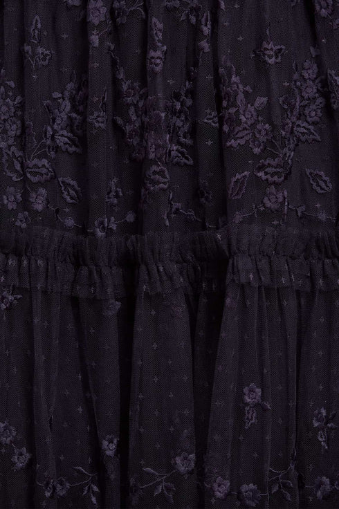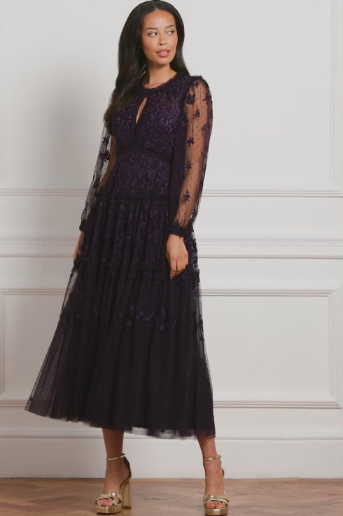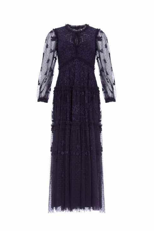 The Autumn Lace Long Sleeve Ankle Gown in Midnight/Blue. This signature Needle & Thread style is designed with floral motif embroidery inspired by antique lace designs. This gown is developed with romantic sheer long sleeves, and a gathered tiered hem, and is created from layers of soft tulle to create a flattering silhouette. A classic and contemporary style.
