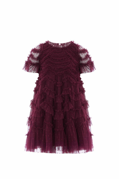 NEW SEASON. The Aviana Kids Dress in Claret. Romantic and rich, this dress encapsulates the Bright Star collection’s archival-inspired texture. Crafted in layers of soft tulle, scallop frills flow across the dress for playful structure and movement. The deep claret shade feels festive and elegant, making this a perfect party dress for the season. Designed to complement the Aviana Short Sleeve Gown in Claret from the womenswear range, ideal for twinning moments.