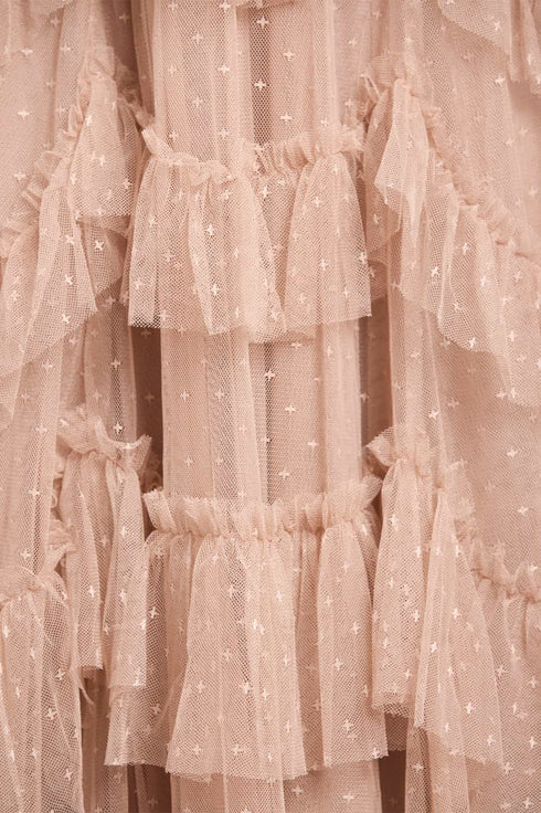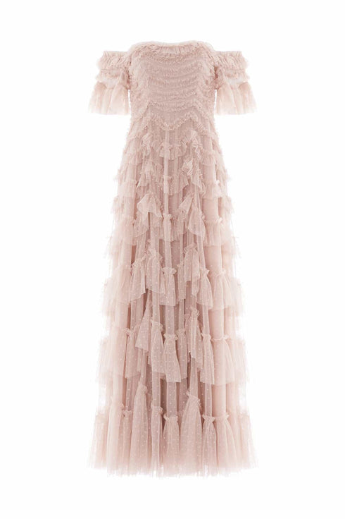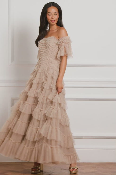 NEW SEASON. The Aviana Off-Shoulder Gown in Sandstone. Drawing from the celestial themes of the Bright Star collection, this gown channels soft romance through rows of delicately topstitched gathered tulle. The scallop frills graduate toward the hem, creating movement and frothy dimension.