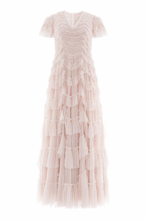 NEW SEASON. The Aviana V-Neck Gown in Oyster. Needle & Thread’s signature textured pieces are reimagined with a beautiful cascading gown in delicate light-toned tulle with a refined neckline. The scalloped frills sweep across the skirt, capturing light and movement with each step.