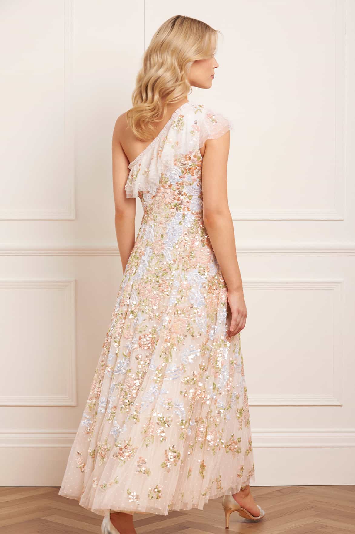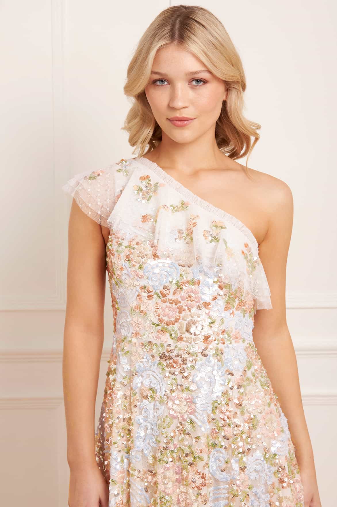 The Baroque Floral One-Shoulder Ankle Gown in Cream. A true statement piece for the season. This show-stopping silhouette features cascading layers of romantic, circle-cut tulle frills, artfully draped across a one-shoulder neckline. Designed with intricate baroque-inspired embroidery, with floral motifs and decorative scrolls. A voluminous skirt, crafted from generous layers of net and tulle, creates graceful movement and dramatic flair. An opulent blend of elegance and texture—perfect for your next unforgettable occasion.