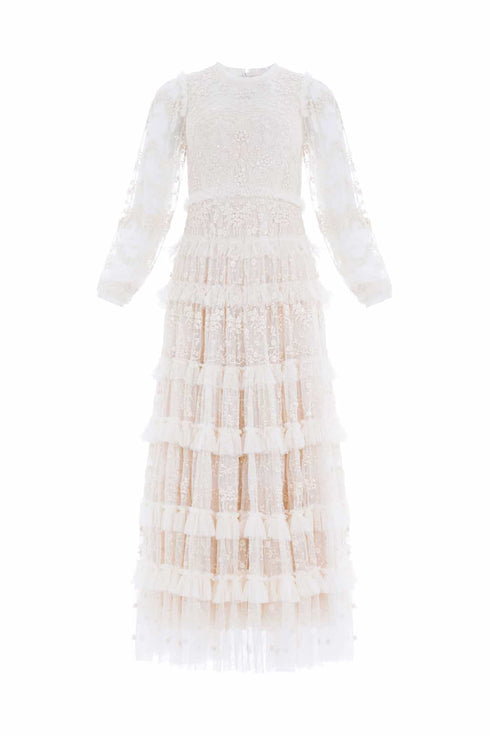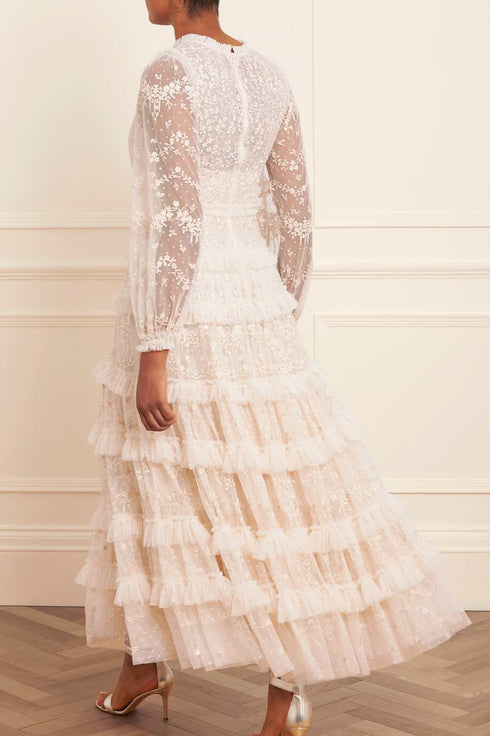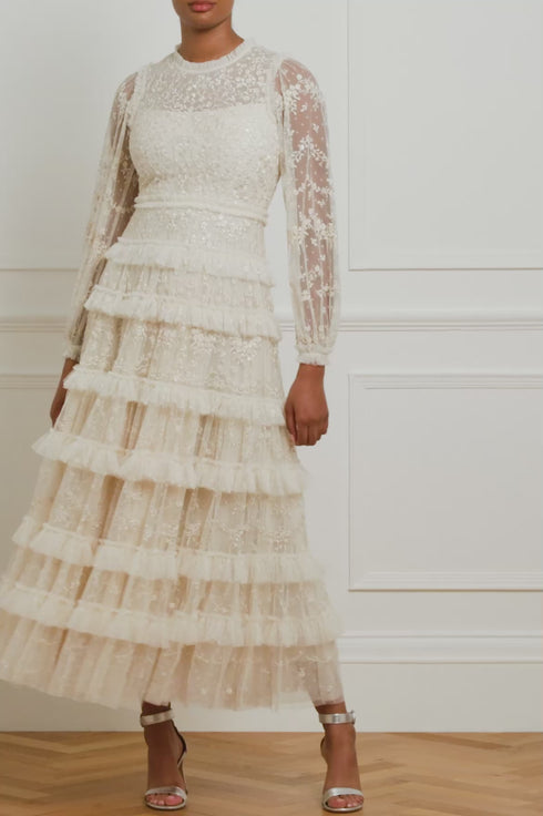 The Blossom Lace Ankle Gown in Cream. Designed with a voluminous silhouette and layered frills, this gown is beautifully decorated with intricate embroidery and subtle clear sequins. A statement piece with a net layer to accentuate its dramatic silhouette. A truly show-stopping style.