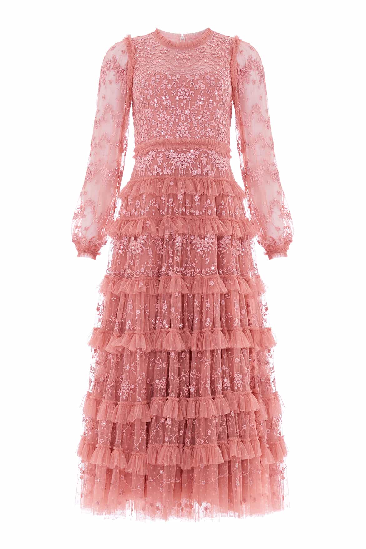 - Form fitted through the bodice with a relaxed fit through the sleeve and a multi-tiered full skirt