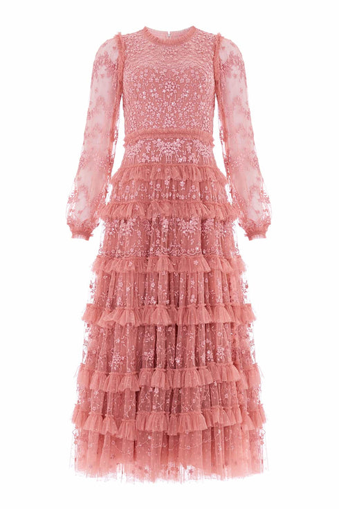 NEW SEASON. The Blossom Lace Ankle Gown in Misty Rose. Crafted with intricate lace inspired by late summer florals, this ankle-length gown embodies effortless femininity. The gently fitted bodice flows into a graceful skirt, offering soft structure and fluid movement. Ideal for elevated evening wear and special occasions.