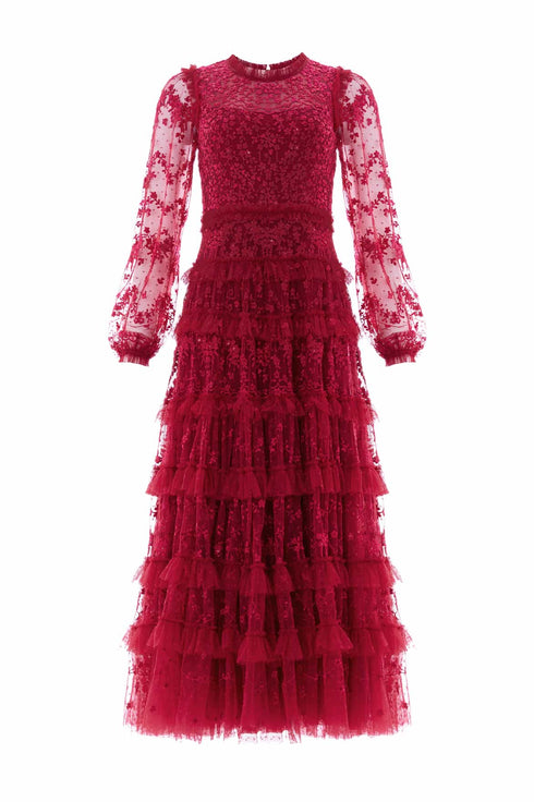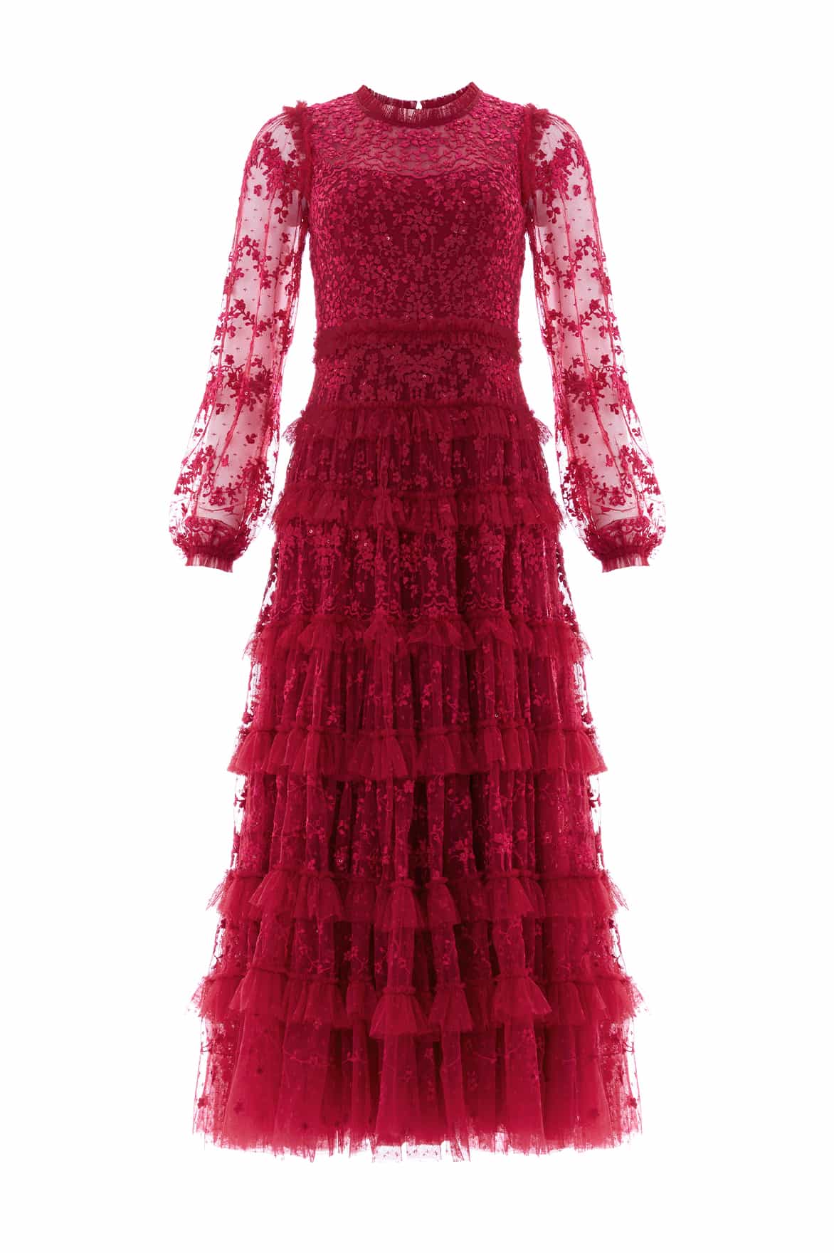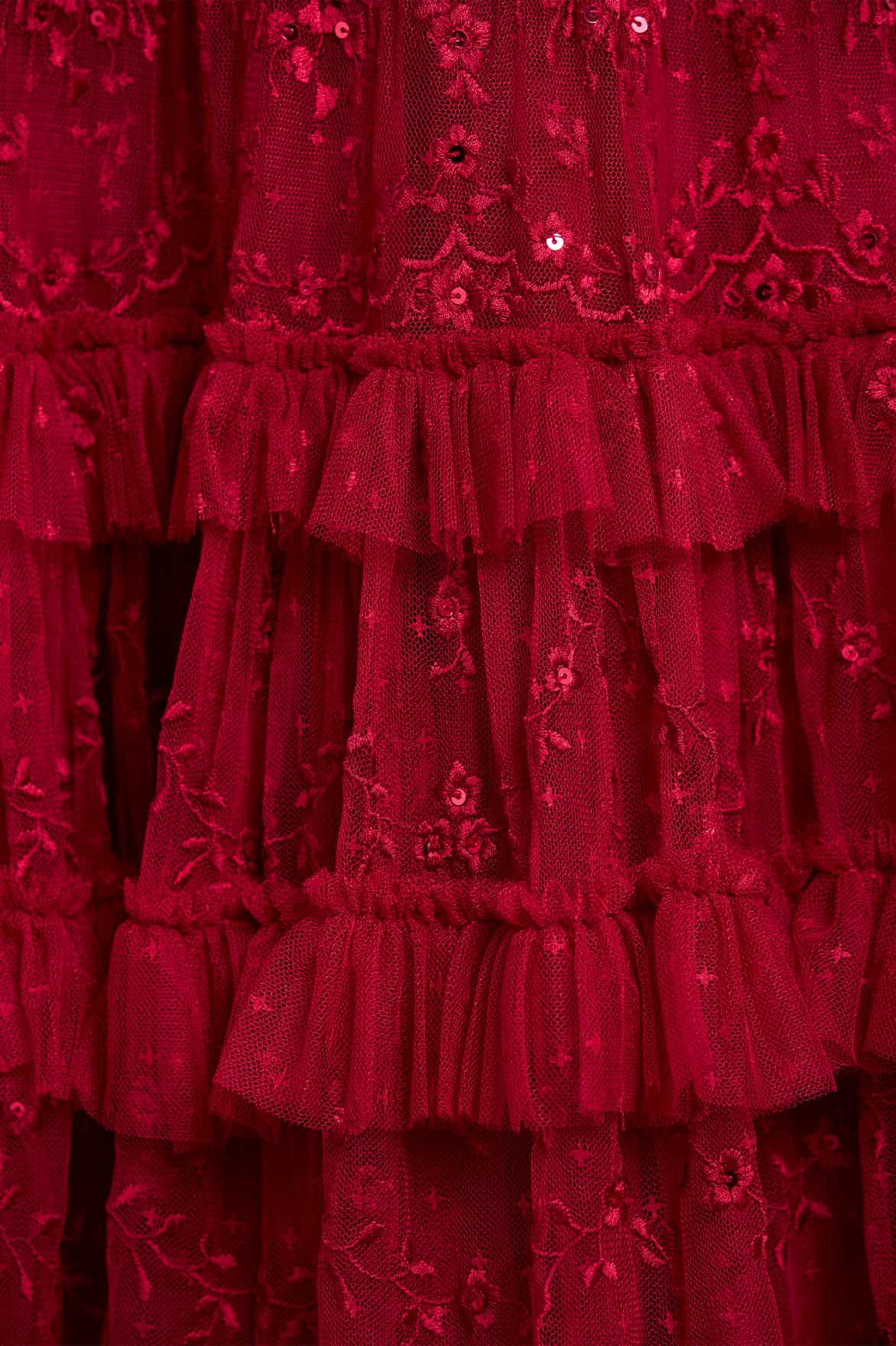 NEW SEASON. The Blossom Lace Ankle Gown in Red. Evoking passion and craftsmanship in equal measure. Layers of sheer tulle embroidered with delicate florals form a flowing, ankle-grazing silhouette. The vivid red hue enhances the feminine detailing and intricate lacework, creating a romantic, heritage-informed look for elegant occasions.