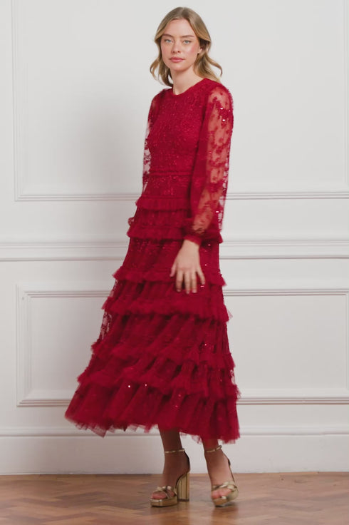 -Form fitted through the bodice with a relaxed fit through the sleeve and a multi-tiered full skirt