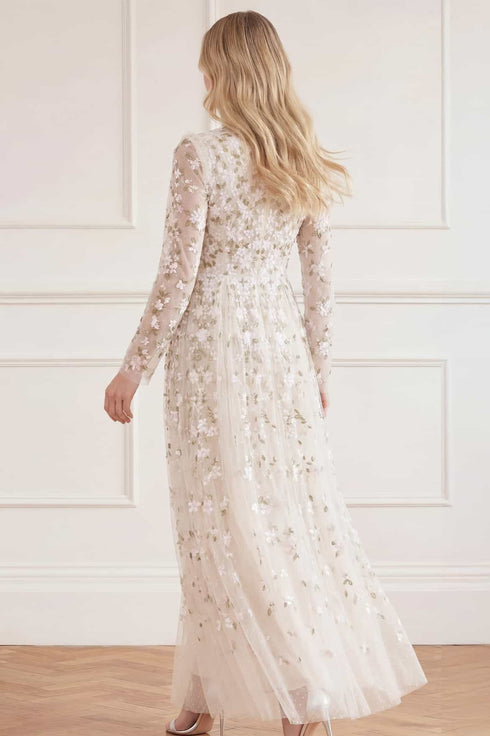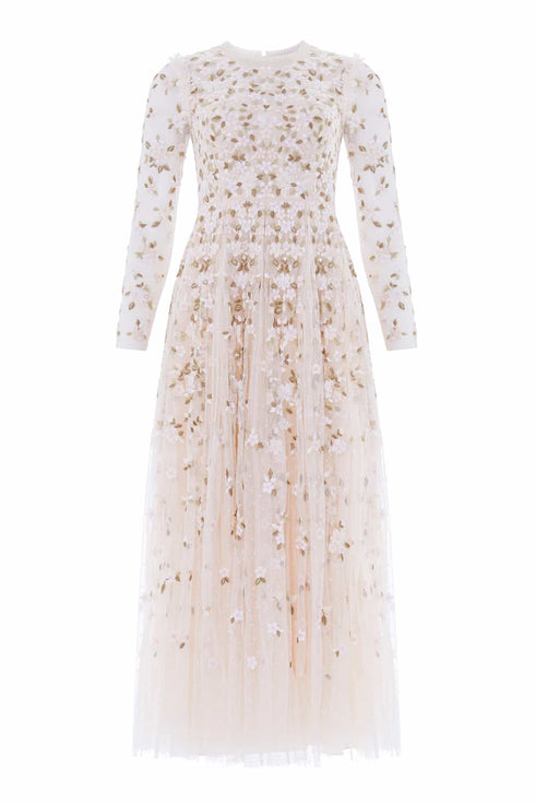 NEW SEASON. The Camellia Ditsy Ankle Gown in Cream/Multi. Adorned with romantic ditsy florals inspired by archival botanical artwork, this ankle-length gown evokes the charm of late summer gardens. The flattering silhouette skims the body before falling into a flowing skirt for effortless movement. A feminine choice for luxury occasion wear.
