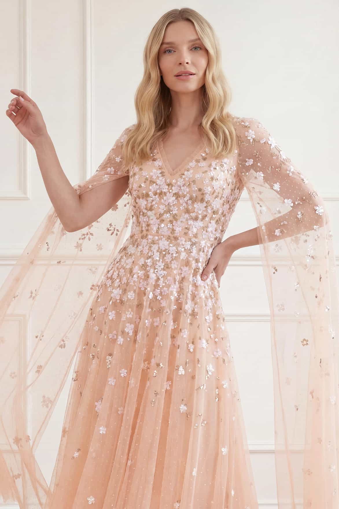NEW SEASON. The Camellia Ditsy Cape Sleeve Ankle Gown in Apricot Blush/Multi. Inspired by the fading tones of summer sunsets, this gown showcases delicate ditsy florals and graceful cape sleeves. The softly flowing ankle-length skirt enhances the feminine silhouette with light, effortless movement. A standout piece for elevated occasion dressing.