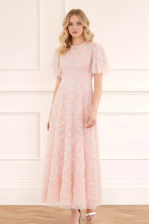 The Carmen Ruffle Ankle Gown in Petal Pink. Where romance meets elegance, the Needle & Thread Carmen Ruffle Ankle Gown is crafted from layers of soft tulle, adorned with exquisite embroidery, and sparkling iridescent sequins to create a beautiful silhouette. Each of the carefully crafted detail evokes the sense of timeless beauty. Layers of tulle give a soft shimmer to gentle ruffles in scalloped sections to create a signature Needle & Thread textured look.