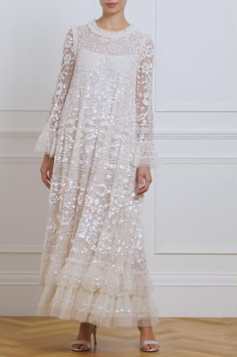 NEEDLE & THREAD EXCLUSIVE. The Celia Long Sleeve Ankle Gown in Cream/Dusk Pink. This statement gown is designed with romantic artwork featuring ornate florals and ribbon bows, densely embellished with shimmering sequins for exquisite detailing. Designed with an effortless loose fit with soft, playful tulle frills on the hem and cuffs. A key piece in our collection.