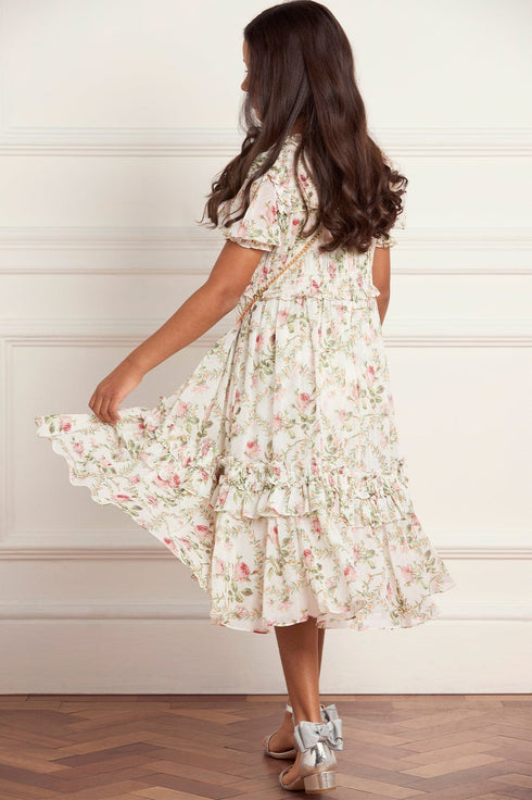 NEW SEASON. The Colette’s Rose Emilia Georgette Kids Dress in Moonshine. A light and airy dress for little ones. Adorned with our heritage-inspired rose print, the dress features shirred detailing and a gently flared shape. A delightful match to the women's Emilia Georgette styles for truly unforgettable twinning moments.