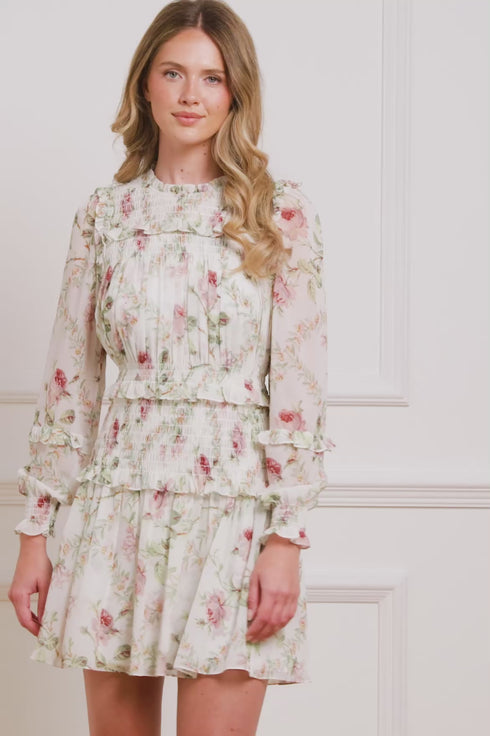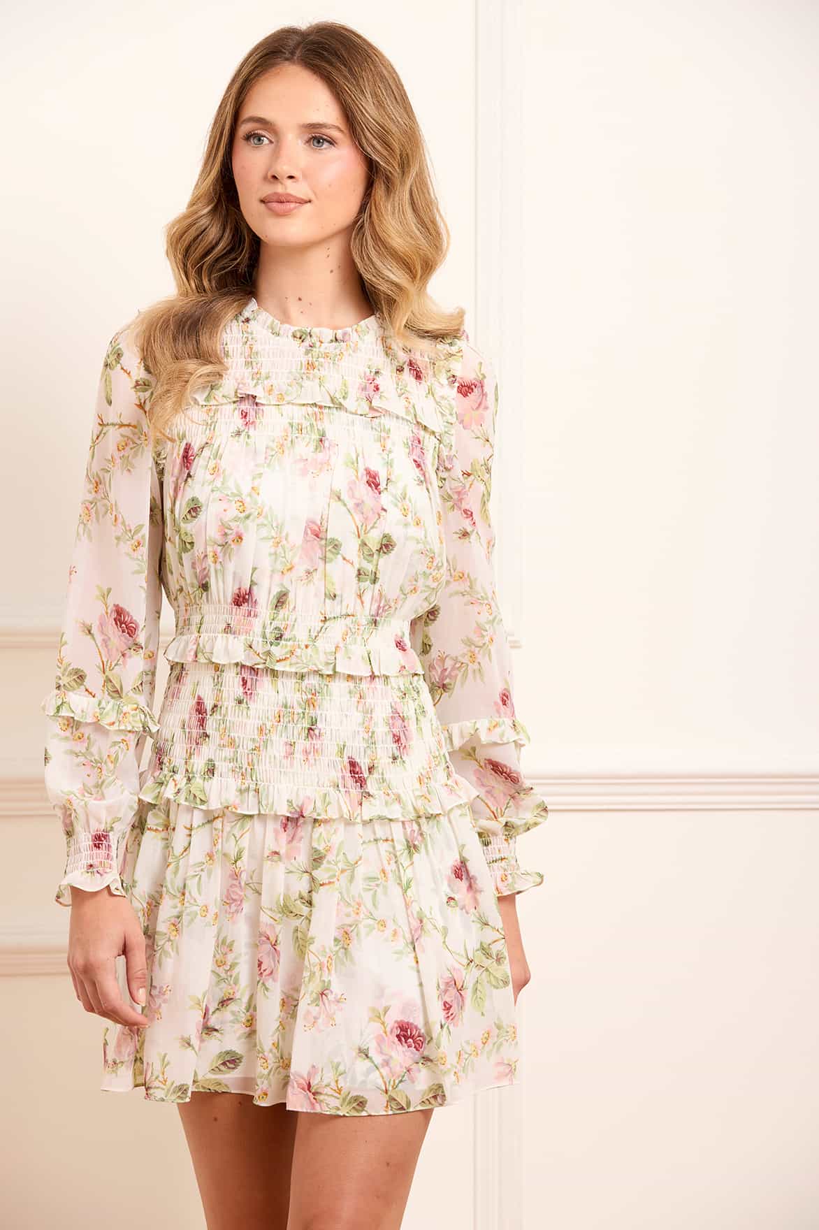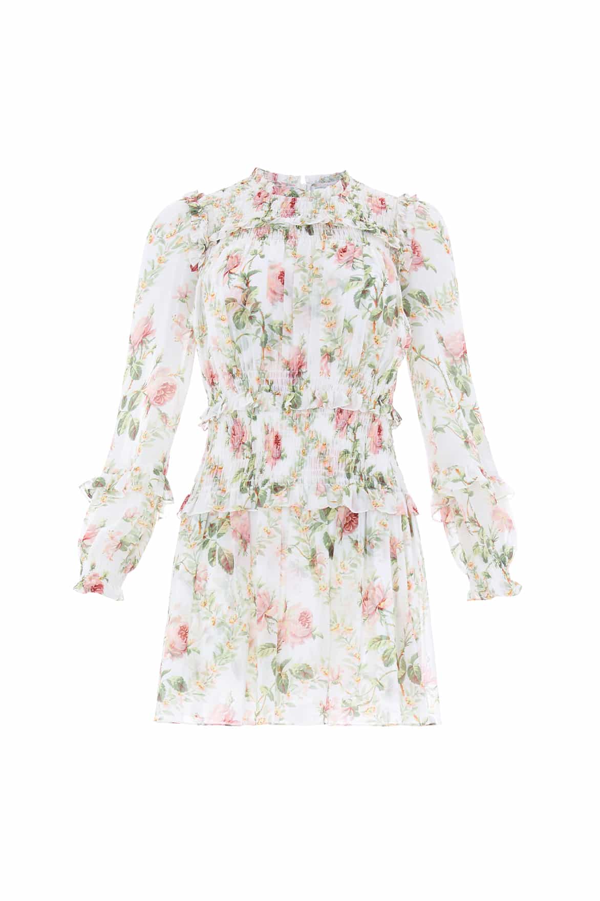 NEW SEASON. The Colette’s Rose Emilia Georgette Micro Mini Dress in Moonshine. A playful and romantic piece. Featuring this season's signature Colette’s Rose floral print, this short silhouette is perfect for dressing up or down.