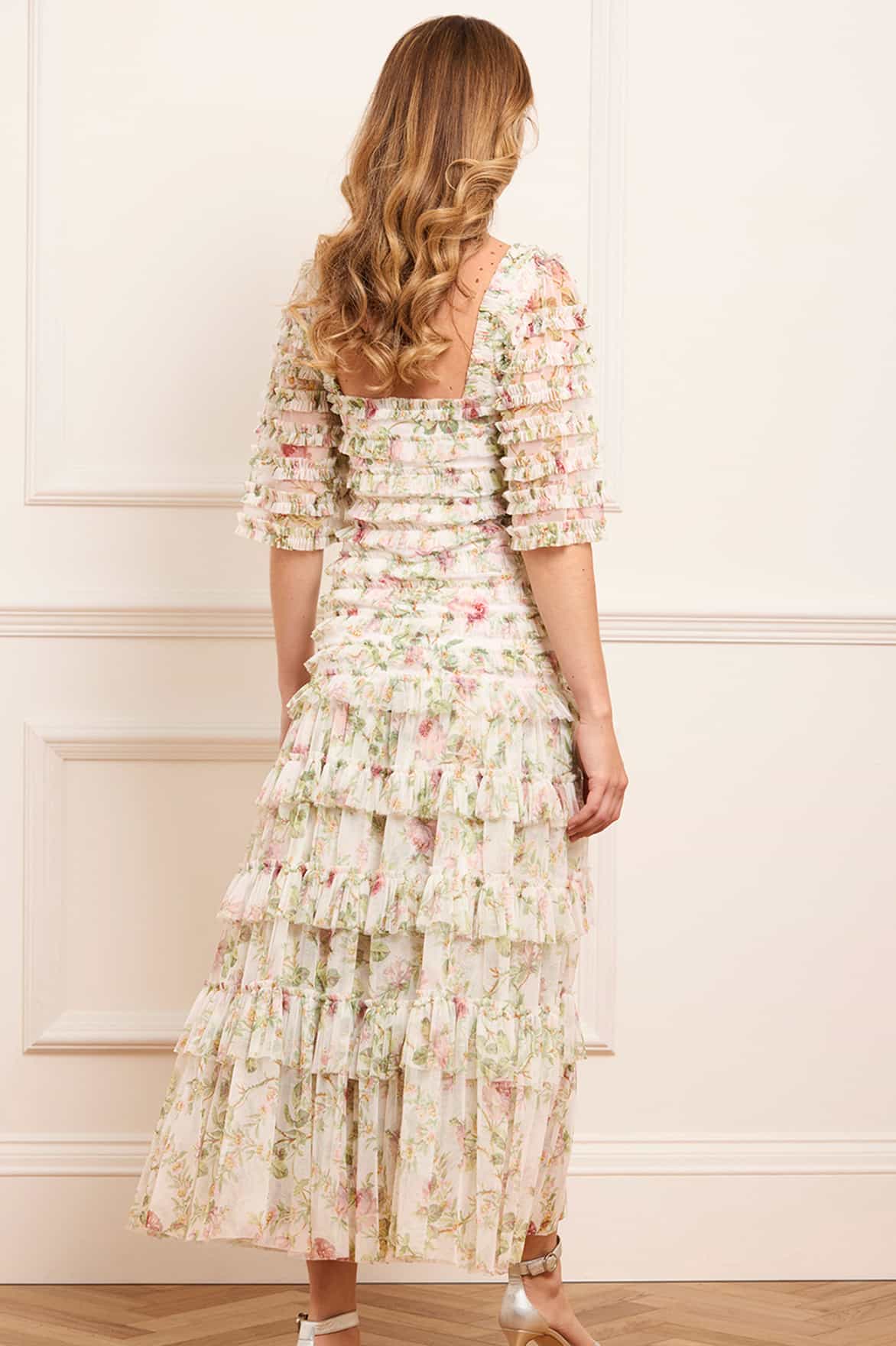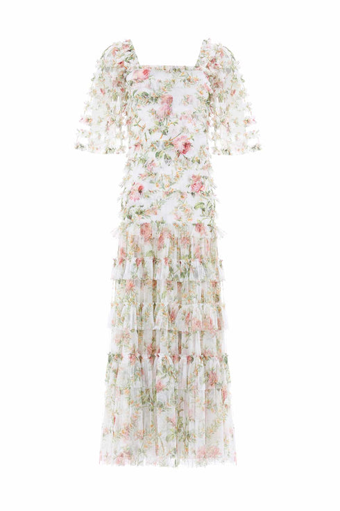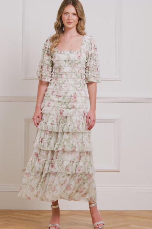 NEW SEASON. The Colette’s Rose Short Sleeve Ankle Gown in Moonshine. This beautiful dress is adorned with our vintage wallpaper-inspired rose print. The hand-painted florals are framed in soft diamond formations and gently fade across the tulle base. Short sleeves, delicate trims and a floaty ankle-length skirt create a beautifully timeless silhouette.