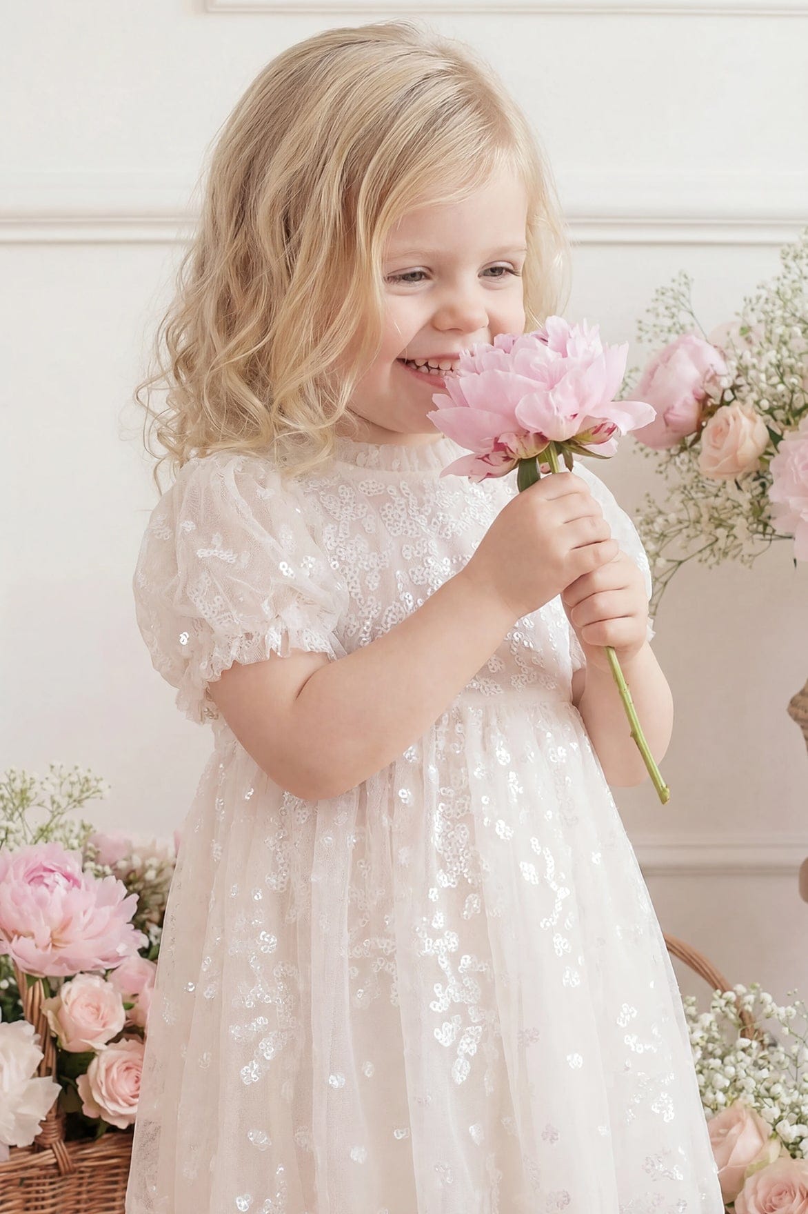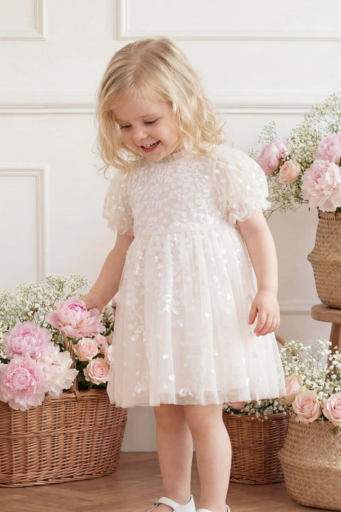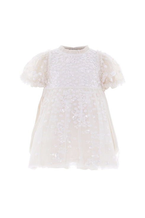 The Confetti Baby Dress in Cream. Delicately adorned with scattered embellishment, creating a soft, playful shimmer. Designed with lightweight layers for comfort and movement, this style offers a whimsical and charming finish.
