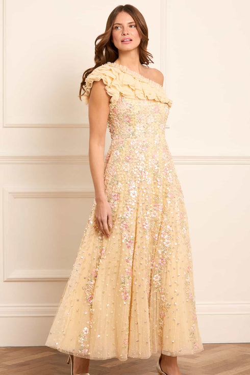 The Confetti One-Shoulder Ankle Gown in Buttermilk/Multi. This gown features soft floral sequin embellishments and a romantic confetti design, with sequins scattering down the gown. Each sequin is coated with a high-shine foil for a lustrous finish. The one-shoulder style is adorned with soft tulle ruffles, while the skirt layers delicate tulle for an added romantic touch, embodying Needle & Thread’s signature elegance. Make a lasting impression in this show-stopping piece