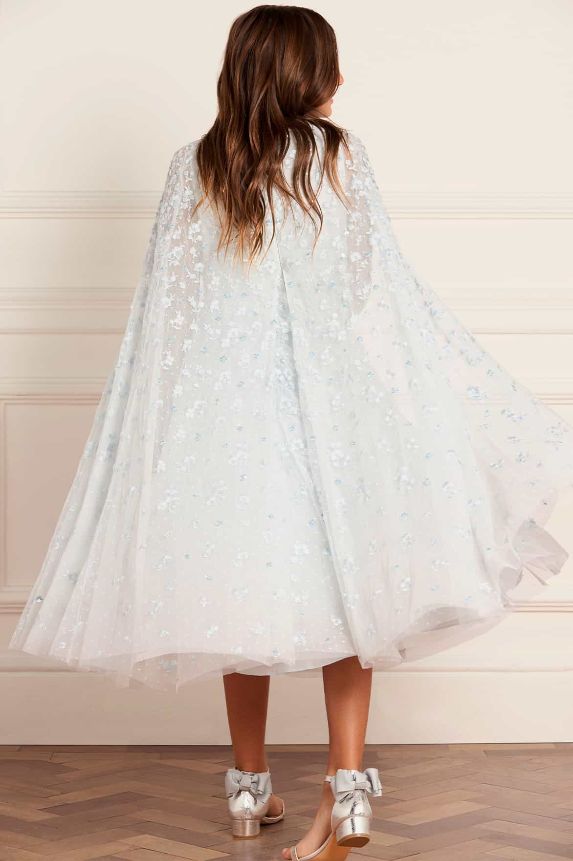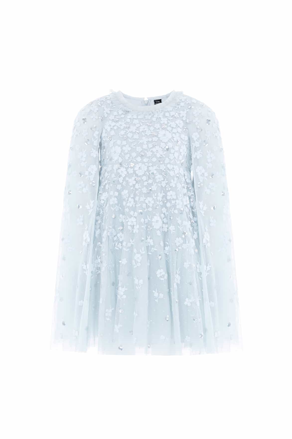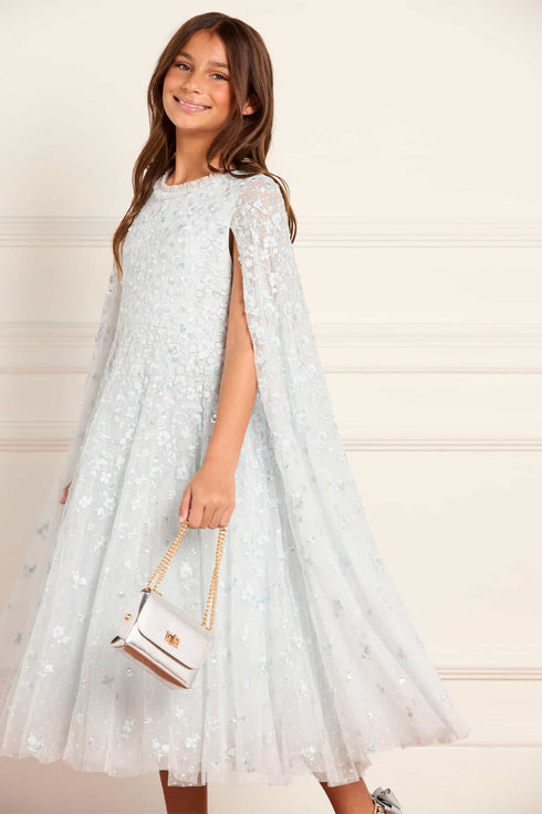 NEW SEASON. The Dahlia Clover Cape Kids Dress in Ice Blue. A sweet design with an embroidered cape overlay. Crafted from layers of airy tulle, it captures playful elegance and freedom of movement.