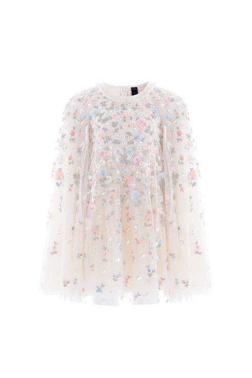 The Dahlia Ditsy Cape Kids Dress in Cream/Multi. This enchanting dress features shimmering sequin dots and delicate floral embroidery. A soft tulle cape, adorned with floral motifs, adds a whimsical touch. With layers of net and tulle for a twirl-worthy skirt, it’s the perfect fairytale dress for your little one’s special occasions.