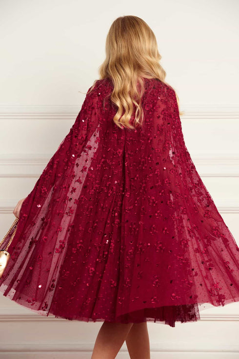 NEW SEASON. The Dahlia Ditsy Cape Kids Dress in Red. A whimsical piece inspired by Victorian florals in the Bright Star story. Designed with embroidered ditsy blooms scattered across tulle, the cape sleeves create an ethereal, fairy-tale effect. The vivid red colour adds festive vibrancy, while the flowing skirt ensures freedom of movement for dancing and play. Pair with the Dahlia Ditsy Cape Gown in Red from the womenswear collection for a mother-and-daughter match.