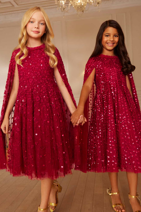 NEW SEASON. The Dahlia Ditsy Cape Kids Dress in Red. A whimsical piece inspired by Victorian florals in the Bright Star story. Designed with embroidered ditsy blooms scattered across tulle, the cape sleeves create an ethereal, fairy-tale effect. The vivid red colour adds festive vibrancy, while the flowing skirt ensures freedom of movement for dancing and play. Pair with the Dahlia Ditsy Cape Gown in Red from the womenswear collection for a mother-and-daughter match.