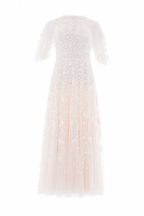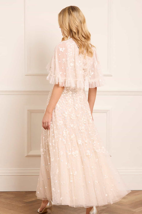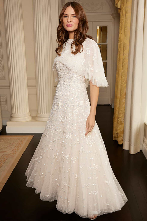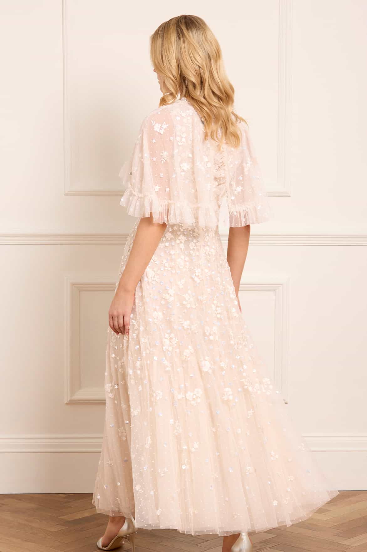 - Form fitted through the bodice with a multi-layered skirt and detachable loose fitting cape