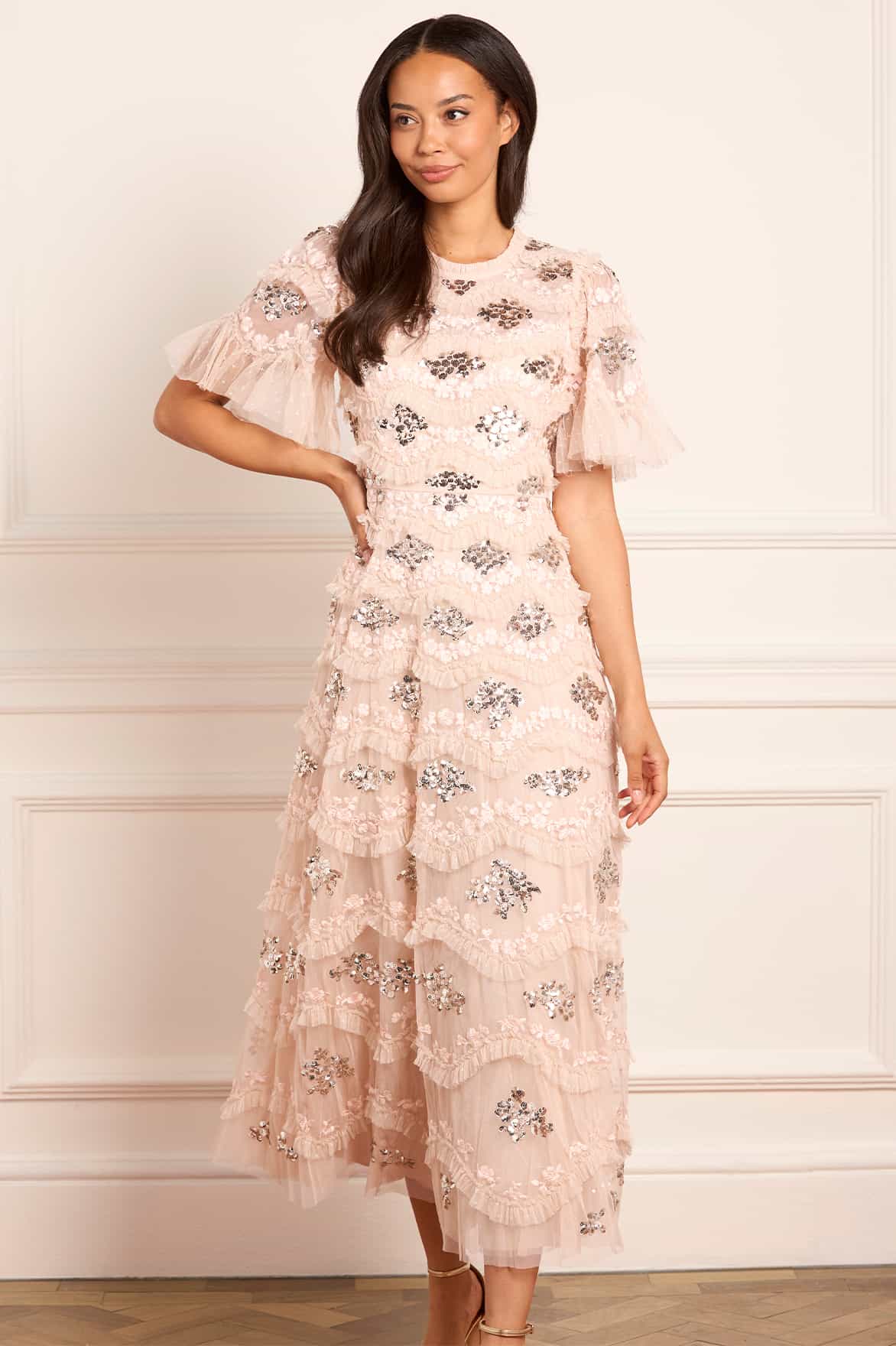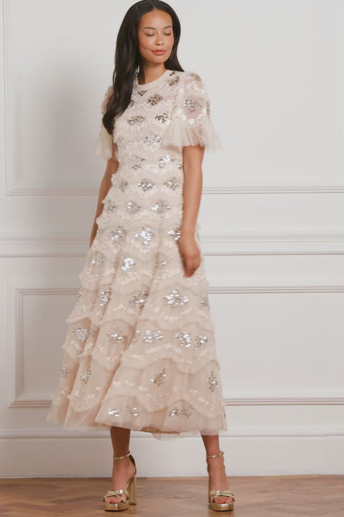 The Daisy Wave Ankle Gown in Dust Beige/Silver. The artwork for this style has been inspired by our 'Daisy Wave' print. Exquisitely detailed textile is created using undulating borders of gathered tulle frills with interspersed intricate lace. Featuring floral artwork with rich, tonal embroidery and shimmering sequins. The perfect gown to take you from day to night.