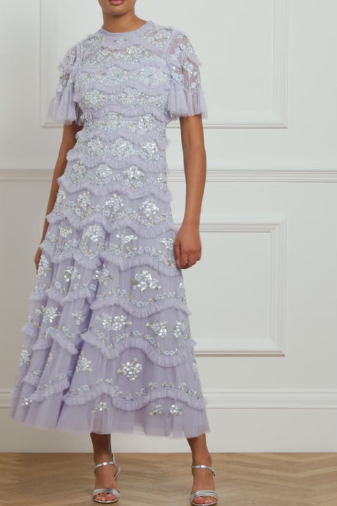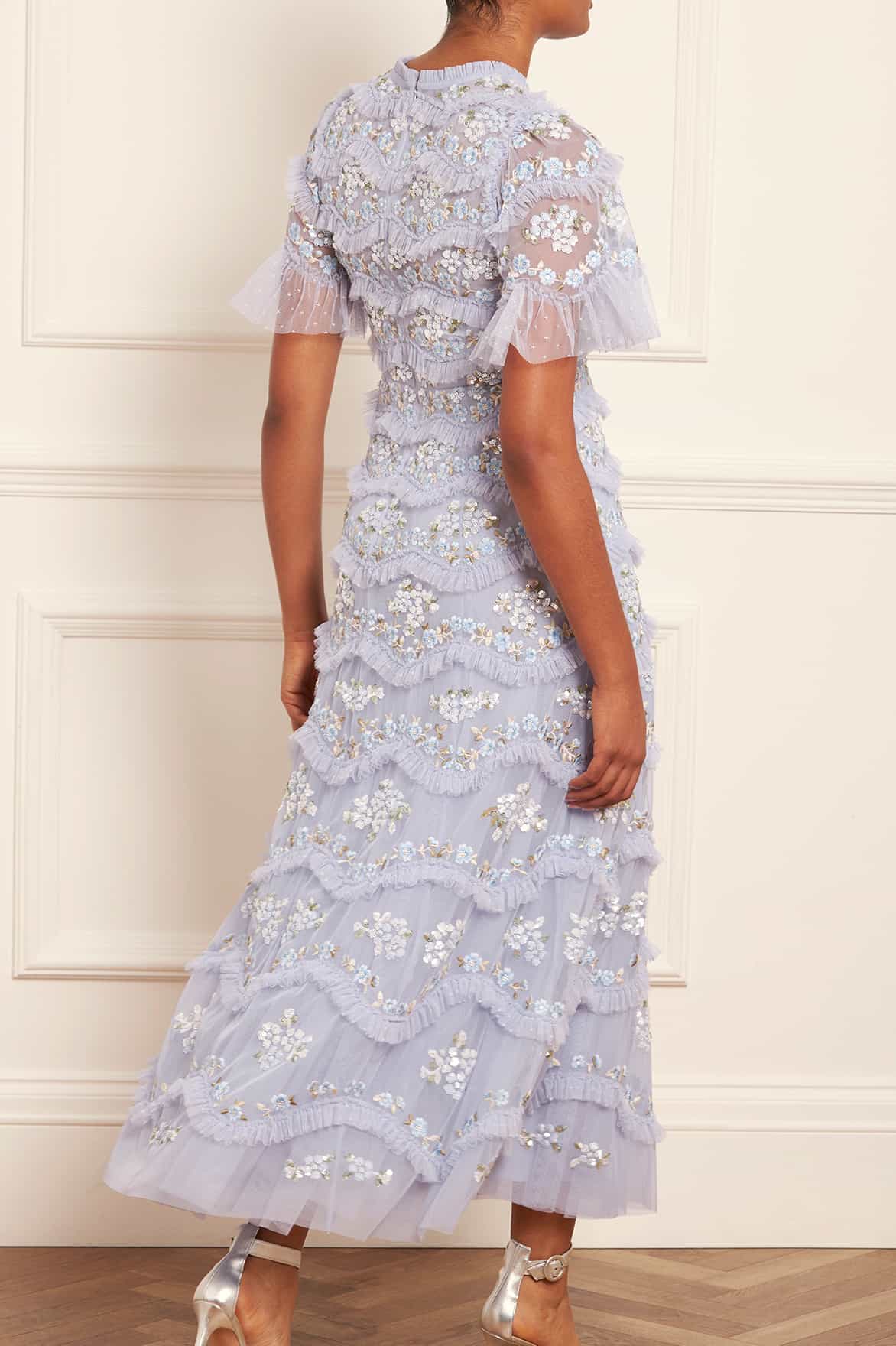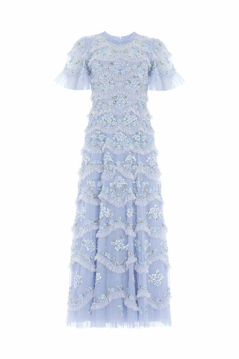 The Daisy Wave Ankle Gown in Iris Blue. The artwork for this style has been inspired by our 'Daisy Wave' print. Exquisitely detailed textile is created using undulating borders of gathered tulle frills with interspersed intricate lace. Featuring floral artworks with rich, tonal embroidery and shimmering sequins. The perfect gown to take you from day to night.