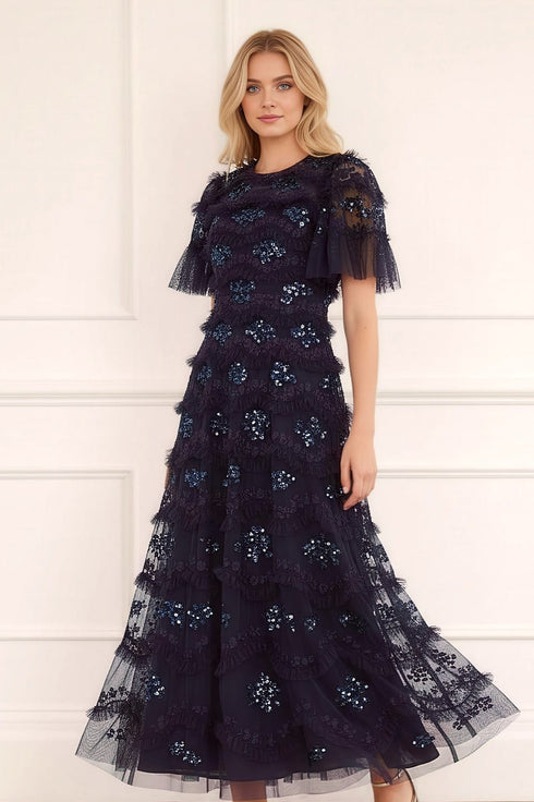 The Daisy Wave Ankle Gown in Midnight. The artwork for this style has been inspired by our 'Daisy Wave' print. Exquisitely detailed textile is created using undulating borders of gathered tulle frills with interspersed intricate lace. Featuring floral artwork with rich, tonal embroidery and shimmering sequins. The perfect gown to take you from day to night.