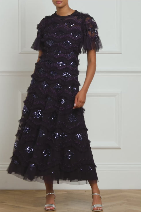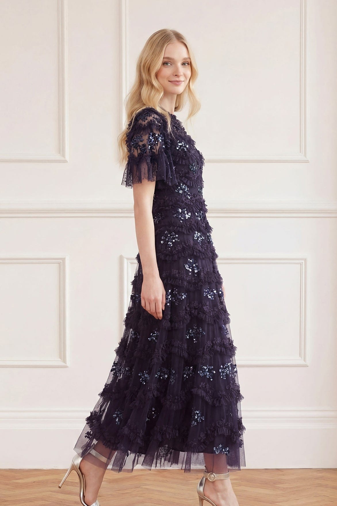 The Daisy Wave Ankle Gown in Midnight. The artwork for this style has been inspired by our 'Daisy Wave' print. Exquisitely detailed textile is created using undulating borders of gathered tulle frills with interspersed intricate lace. Featuring floral artwork with rich, tonal embroidery and shimmering sequins. The perfect gown to take you from day to night.