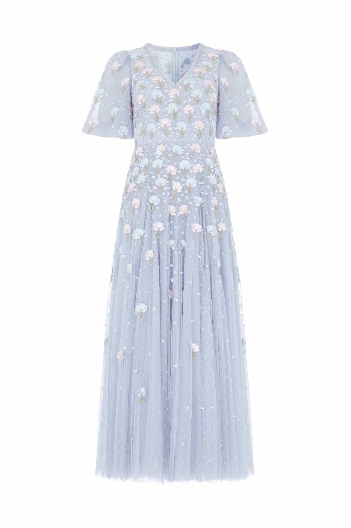 NEW SEASON. The Dandelion Ditsy Ankle Gown in Skylight. Showcases soft floral embroidery that gently fades toward the hem. Crafted from layers of fine tulle, this gown radiates lightness and romantic sophistication. A timeless evening statement.