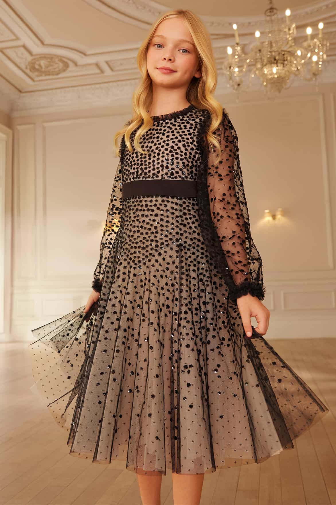 NEW SEASON. The Dappled Sequin Long Sleeve Kids Dress in Graphite/Opal. A shimmering design ideal for festive occasions. Crafted from signature kisses 'x' motif tulle, the dress features a gradient of clustered sequins fading into a flared skirt. Pairs beautifully with the women's Dappled Sequin Gown for a chic coordinated look.