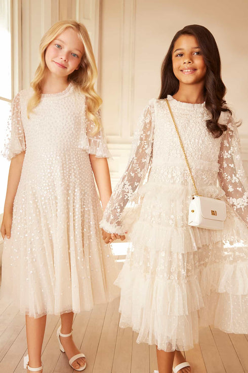 The Dappled Sequin Short Cape Kids Dress in Cream. This dress sparkles with shimmering dot motifs that twinkle and dance toward the hem, creating a delightful glittering effect. The playful cape with a frilly edge adds a touch of fairytale magic, while the chevron seaming on the skirt ensures a flattering, pretty fit. The voluminous tulle skirt, with its soft, layered fullness, sways beautifully—perfect for endless twirls and making every moment feel like a dream come true.