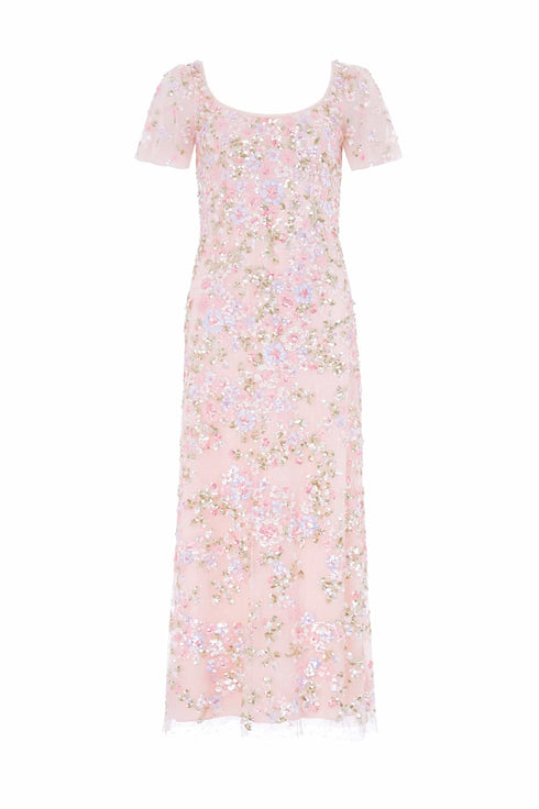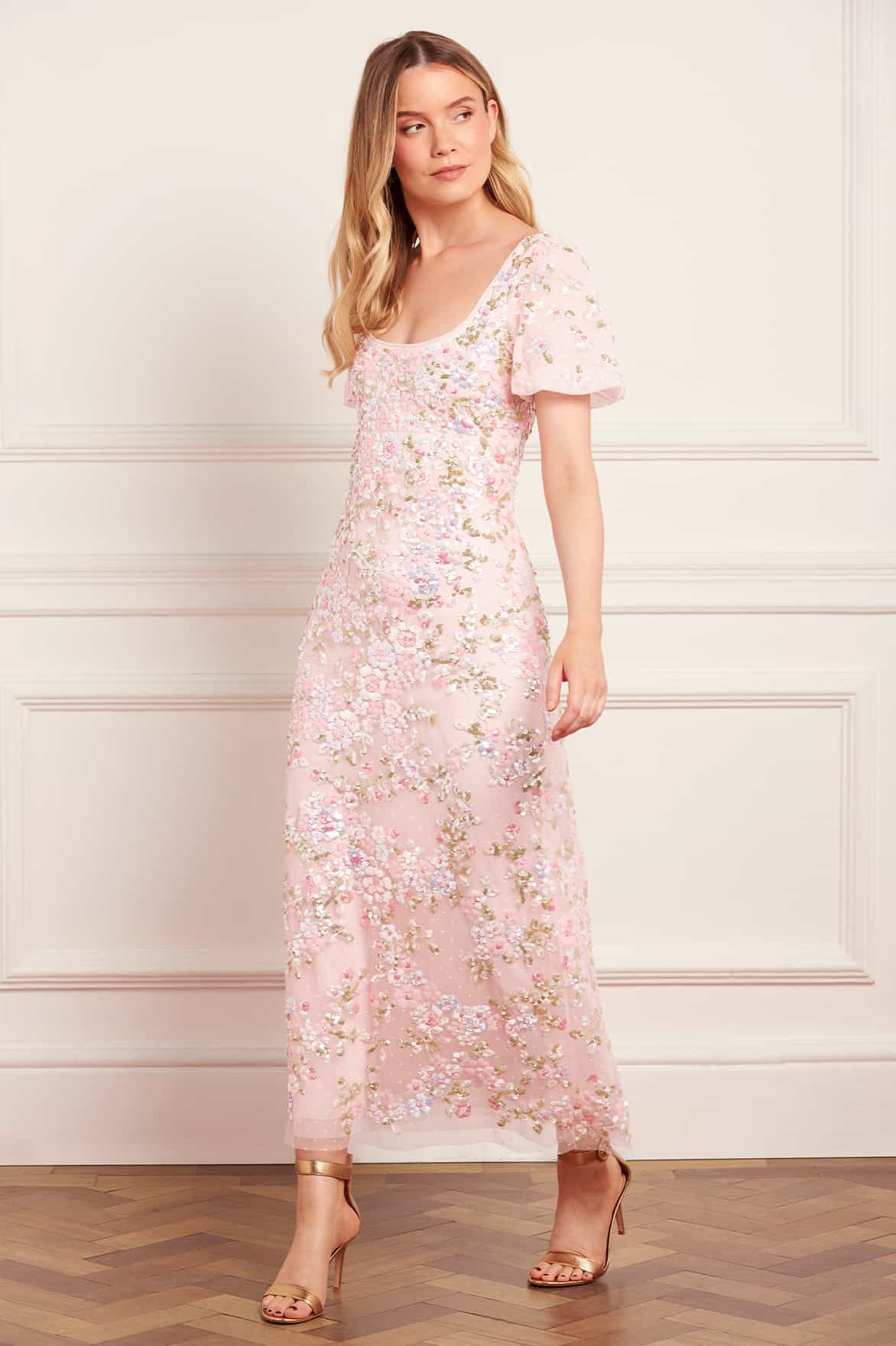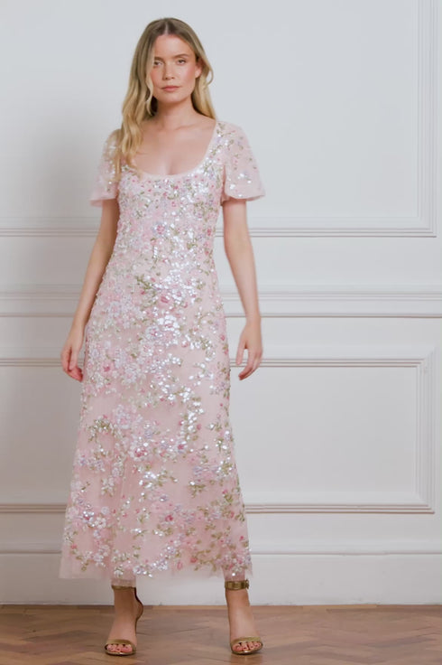 NEW SEASON. The Dream Garland Puff Sleeve Ankle Gown in Seashell/Multi. Features exquisite floral embroidery inspired by vintage craftsmanship. With soft puff sleeves and a flowing skirt, this gown is an ode to romance and delicate femininity.