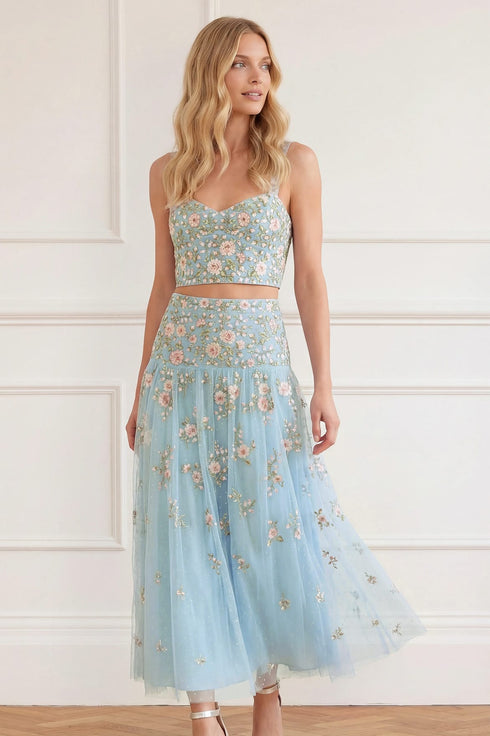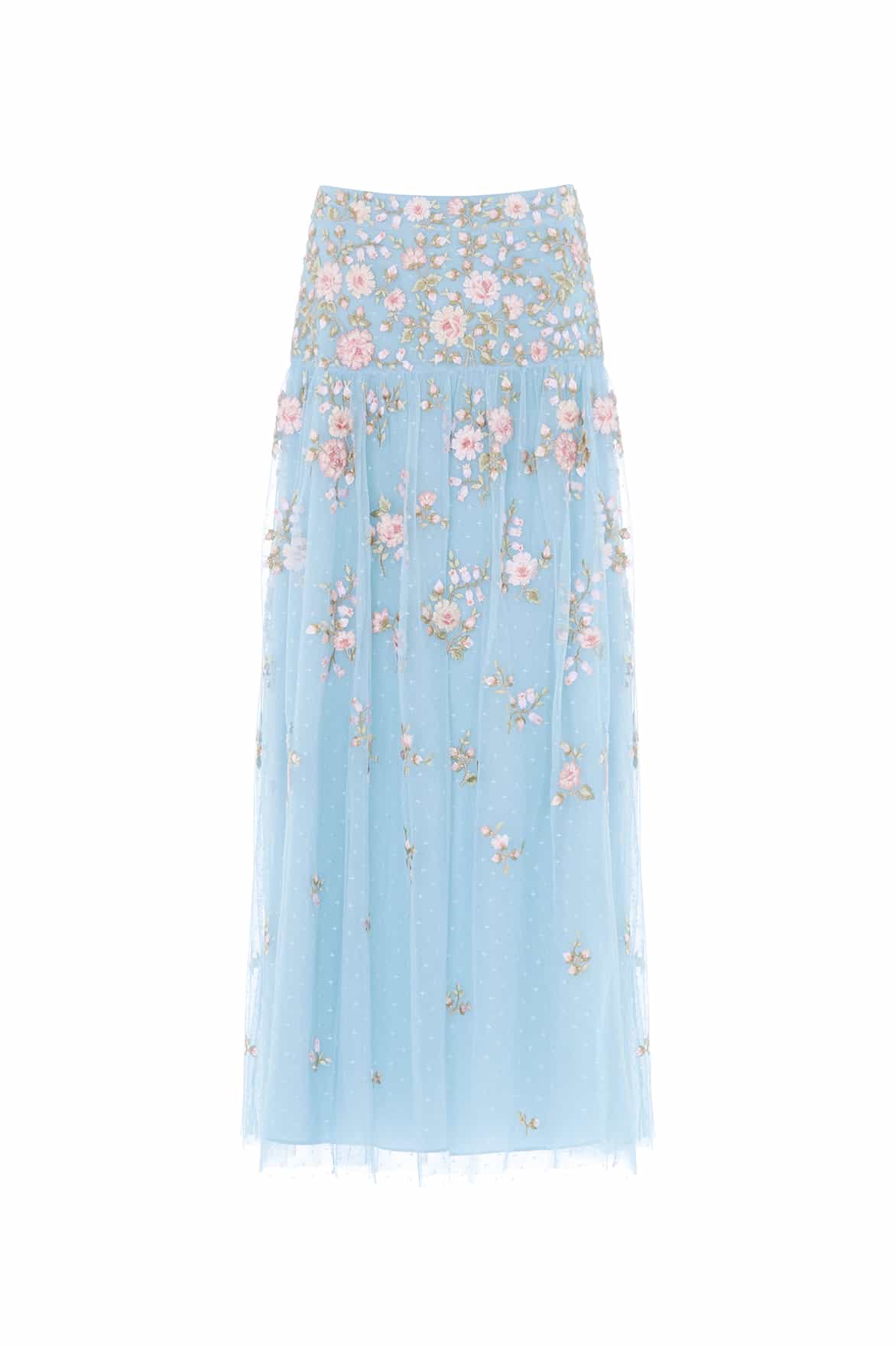 NEW SEASON. The Eden Rose Ankle Skirt in Aqua/Multi. This elegant ankle skirt features cascading Eden Rose embroidery that disperses into delicate ditsy florals towards the hem. Designed with a fluid silhouette for effortless movement, it is the perfect pairing with our coordinating Eden Rose top for summer occasion wear.