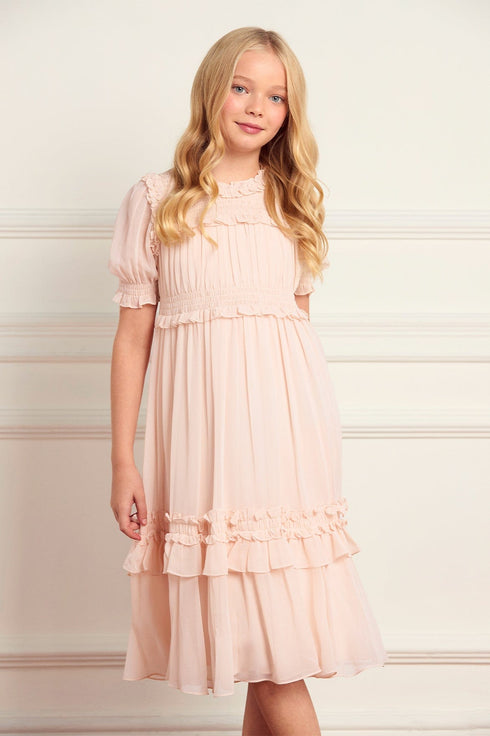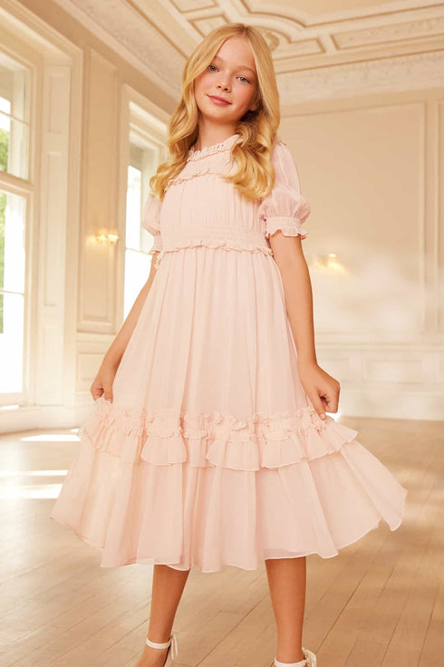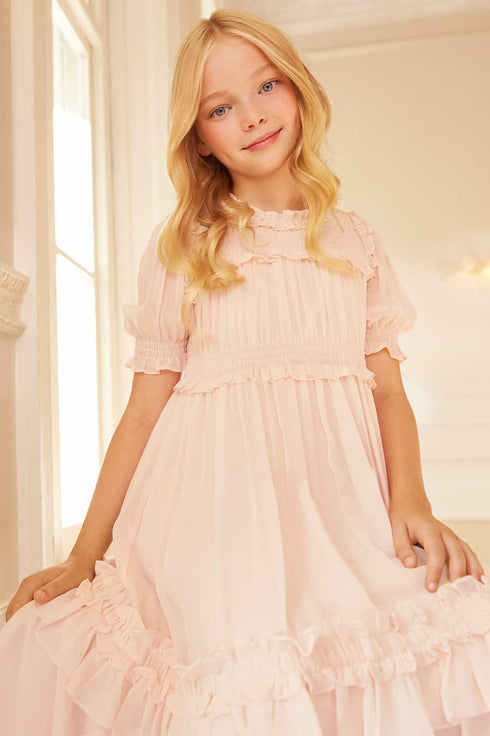 NEW SEASON. The Emilia Georgette Kids Dress in Opal. A light and flowy silhouette crafted in delicate georgette. With gentle shirring at the waist and sleeves, this piece is perfect for flower girls or any special event. Style with the matching women's Emilia Crepe Dress for a sweet family matching moment.
