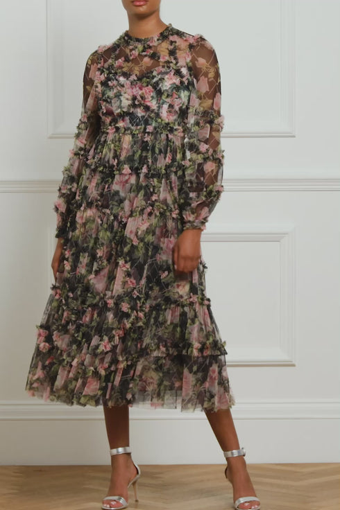 The English Rose Diamond Ruffle Ballerina Dress in Graphite. This ballerina dress is inspired by a traditional rose print taken from a 1900s hand-painted artwork, in soft hues of deep pinks. Developed with signature Needle & Thread styling featuring perfectly engineered frills for all-over delicate texture. The perfect dress to take you from dinner to the dancefloor.