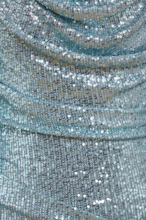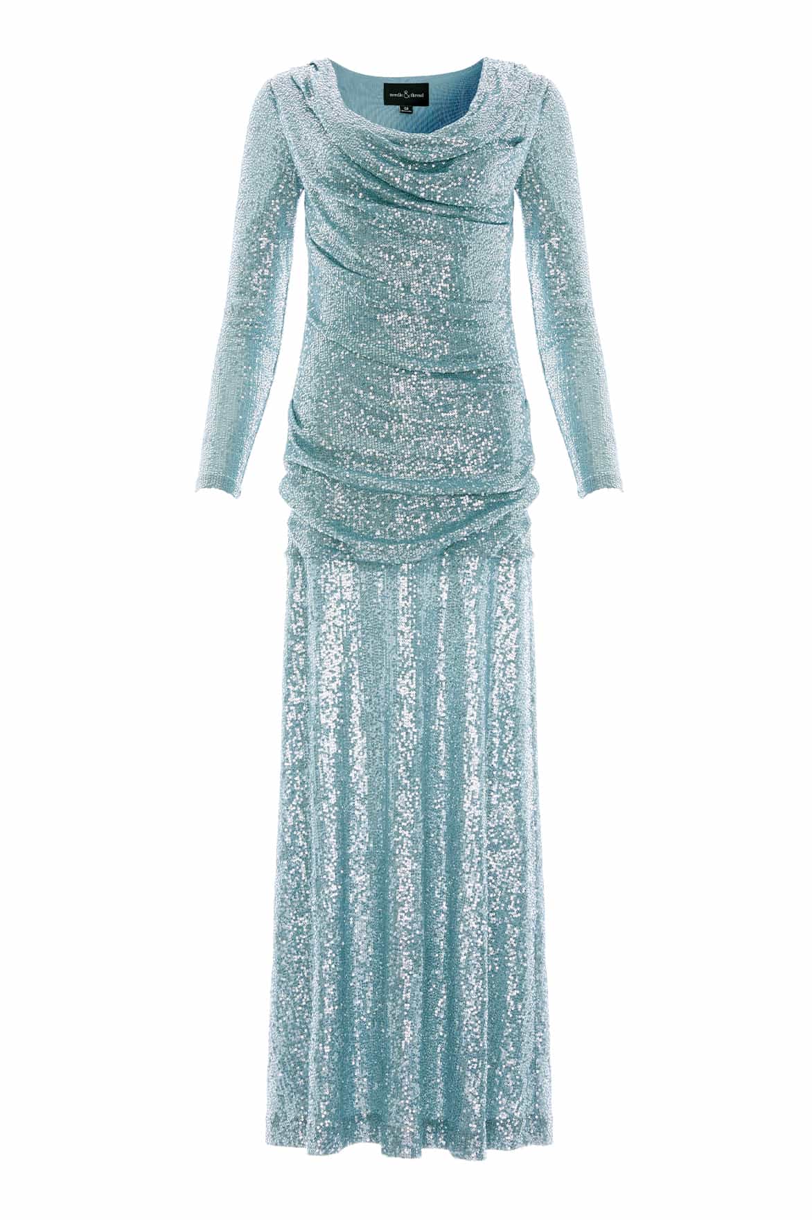 The Erin Long Sleeve Gown in Thistle Blue. This gown exudes timeless Hollywood glamour. This gown is meticulously crafted through draping to achieve perfectly positioned pleats and folds for a flattering shape. The elegant cowl neckline is adorned with countless glittering sequins, while the slim silhouette gently drapes across the body. A fluid, sweeping skirt adds movement, complementing the slim long sleeves. The gown is made from a specially developed fabric featuring sequins, delicately stitched onto a stretch mesh base, creating a shimmering, all-over effect for a truly radiant look.