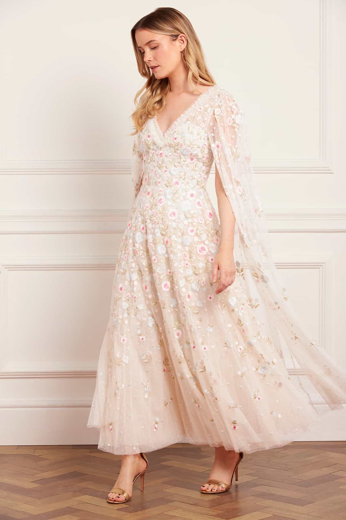 NEW SEASON. The Ethereal Blooms Cape Sleeve Ankle Gown in Cream/Multi. Decorated with soft floral embroidery in shimmering pastel tones. Designed with flowing cape sleeves and a gentle A-line silhouette, this gown embodies delicate femininity and effortless sophistication.