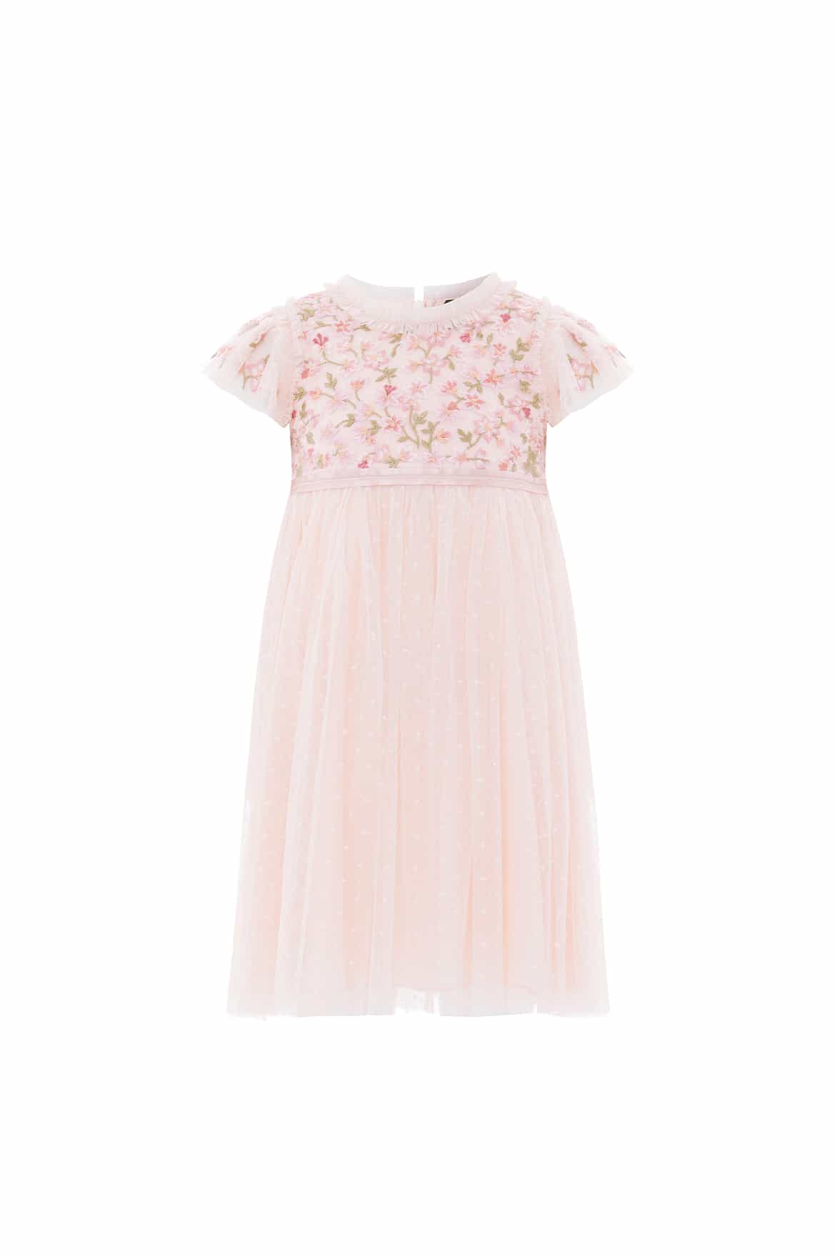 NEW SEASON. The Everett Bloom Bodice Kids Dress in Opal/Multi. A delicate style for girls adorned with bold floral embroidery and a structured bodice flowing into a magical tulle skirt. This dress is made for standout moments. Match with the women's Everett Bloom Gown for a fully coordinated family party look.