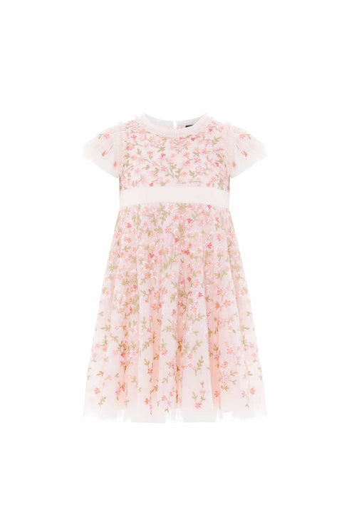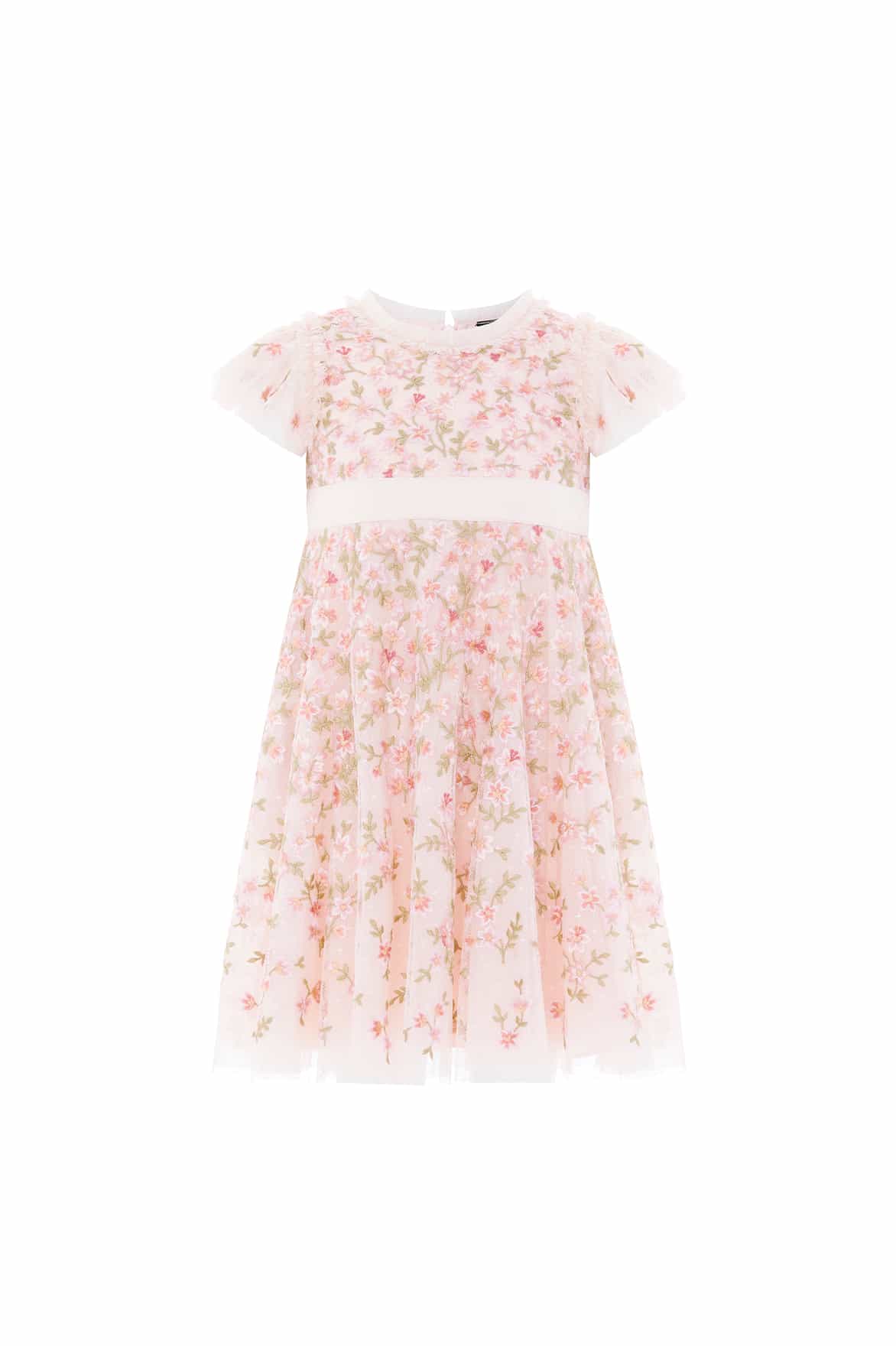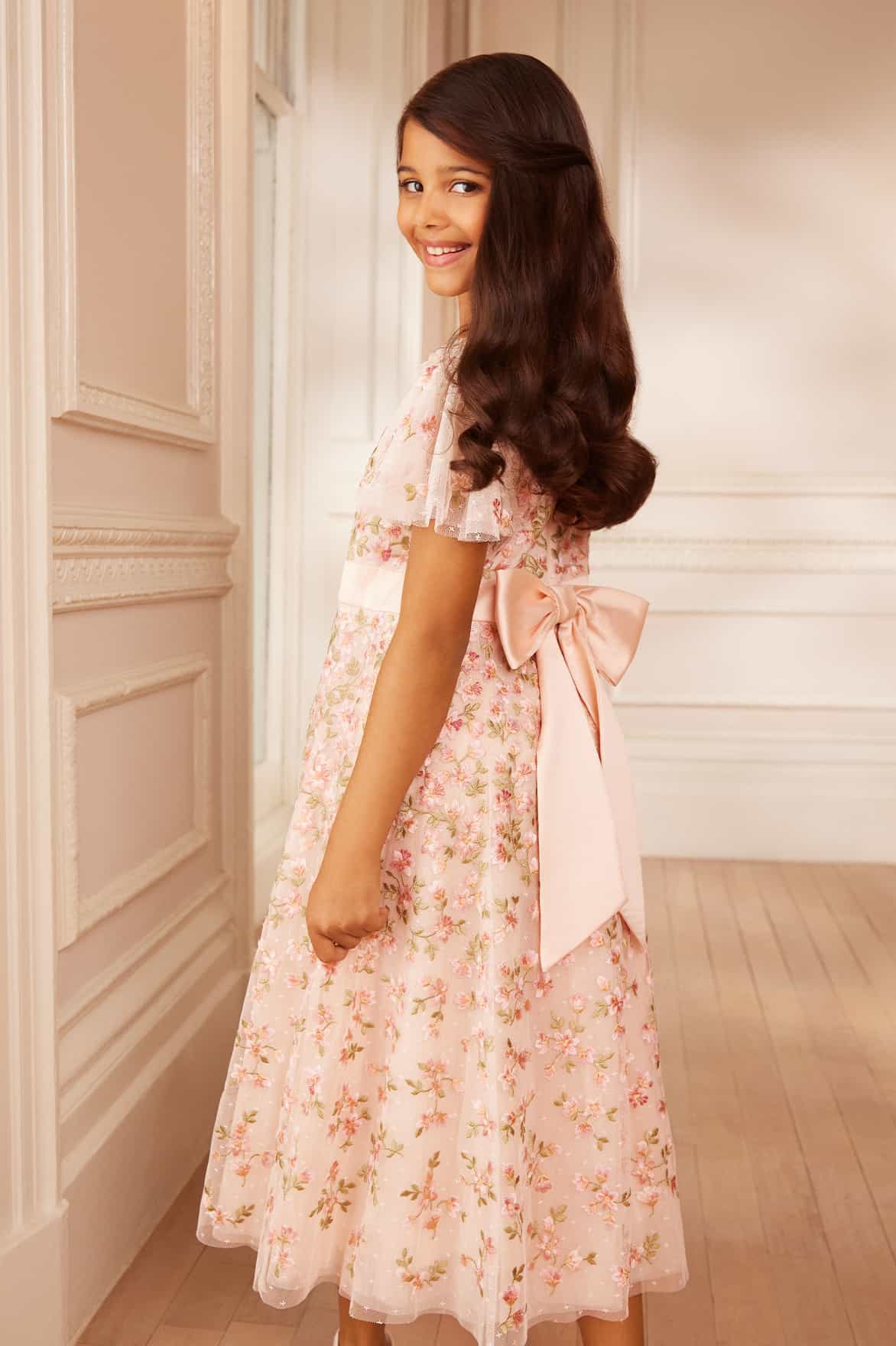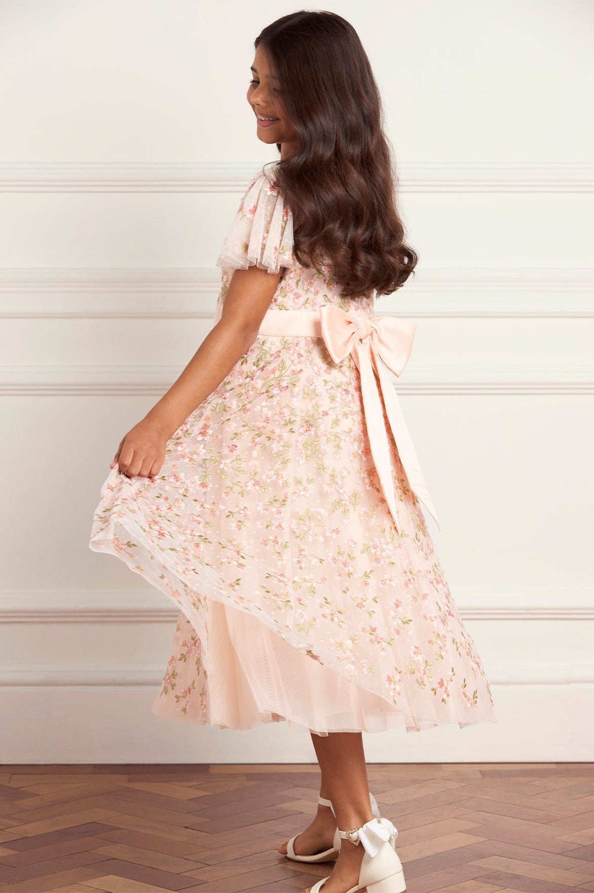 NEW SEASON. The Everett Bloom Kids Dress in Opal/Multi. This design is decorated with whimsical floral embroidery and crafted in soft layered tulle. The relaxed shape and soft colours make it ideal for unforgettable moments. Pairs beautifully with the women's Everett Bloom Gown from the AW25 collection.