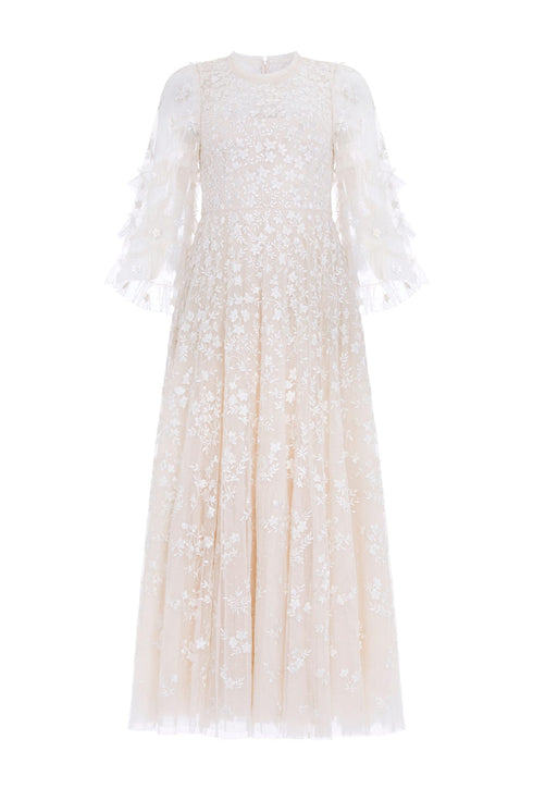 The Everett Bloom Round Neck Ankle Gown in Cream/Cream. This beautiful gown features exquisite, embroidered artwork inspired by a vintage archive print that showcases floating florals. Beautifully decorated with floral clusters cascading gently toward the hem, enhancing the romantic charm. Designed with fluted sleeves adorned with frothy tulle ruffles and embroidered floral motifs, while the neckline, shoulders, and cuffs feature signature Needle & Thread tulle frills for a touch of romantic elegance. The skirt is composed of generous layers of net and tulle, culminating in a sweeping hemline that adds to the gown's enchanting allure.