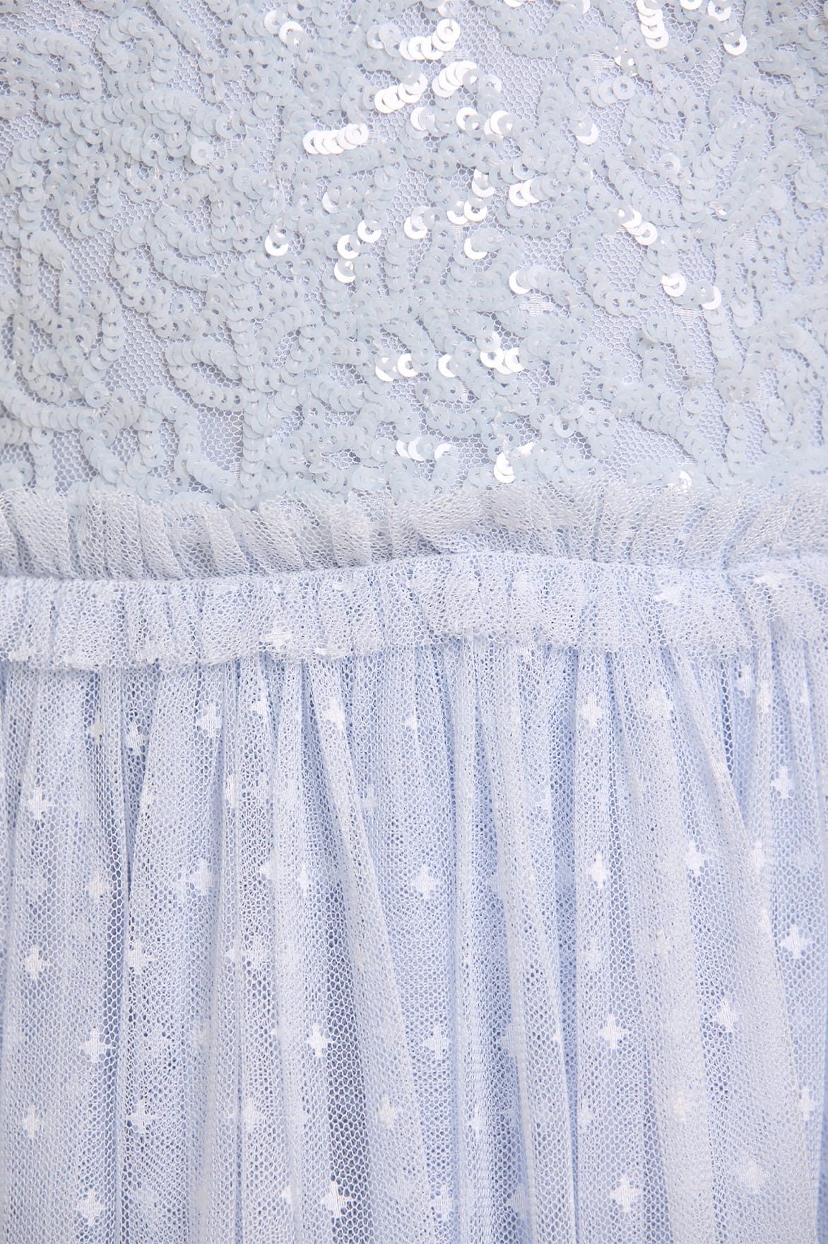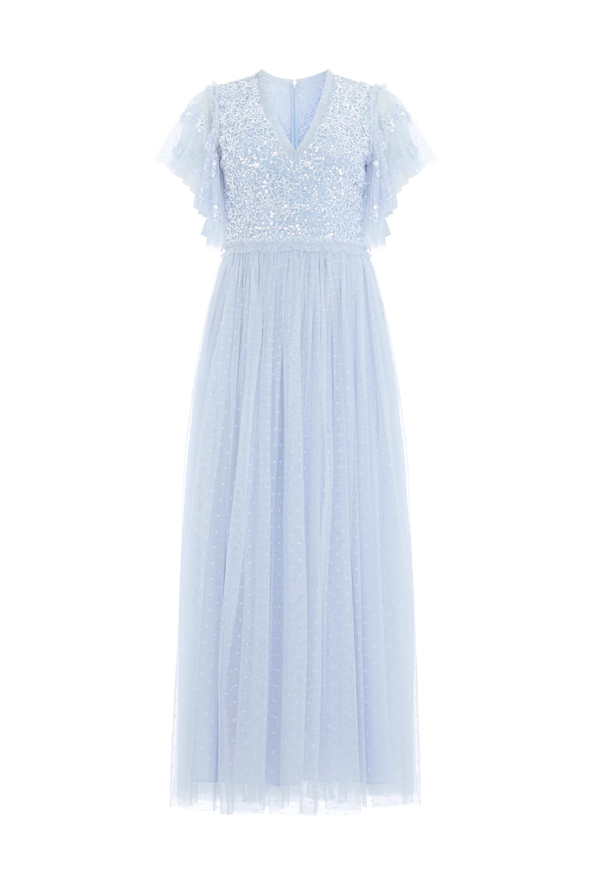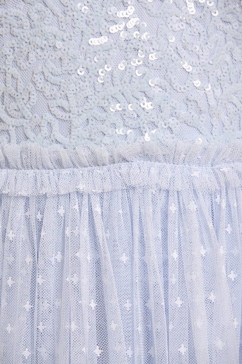 The Floral Lace Bodice V-Neck Ankle Gown in Dusk Blue. The bodice is adorned with shimmering sequin embellishments, featuring sequins with a special high-shine gloss finish created by an extra foil coating added to each sequin for an extra lustrous look. The flattering V- neckline, shoulders, and waistband are trimmed with signature Needle & Thread delicate tulle ruffles, while ethereal floaty frill sleeves add a touch of romantic styling. The skirt is crafted from layers of signature Needle & Thread soft tulle, enhancing the gown's enchanting allure.